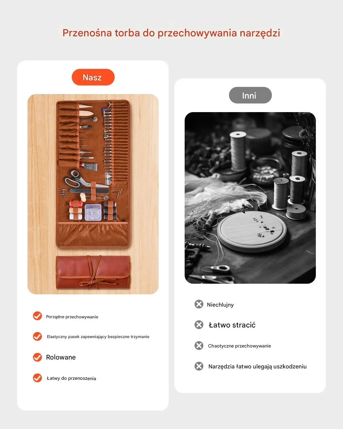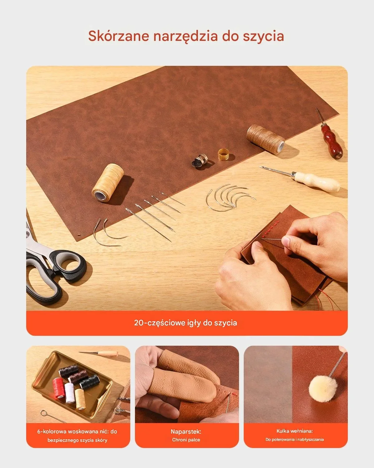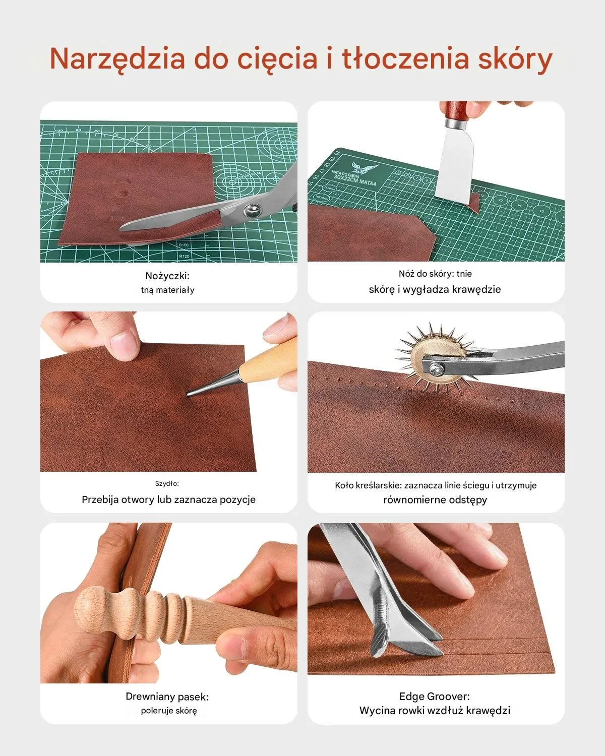 - ✅ Pełne wyposażenie: 72 narzędzia do cięcia, tłoczenia, szycia i obróbki skóry