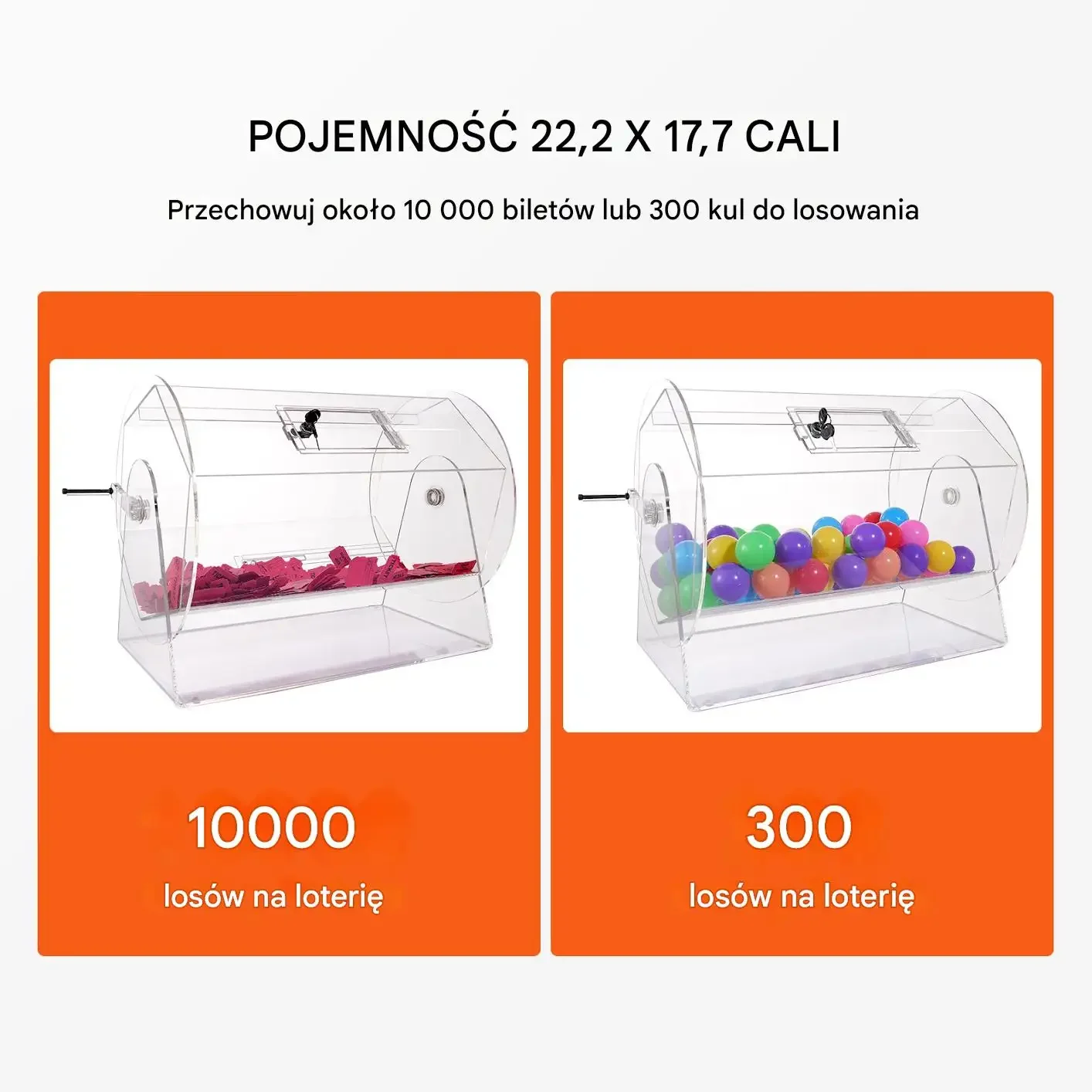 • Wysoka pojemność: pomieści aż 10 000 losów lub 300 kulek loteryjnych