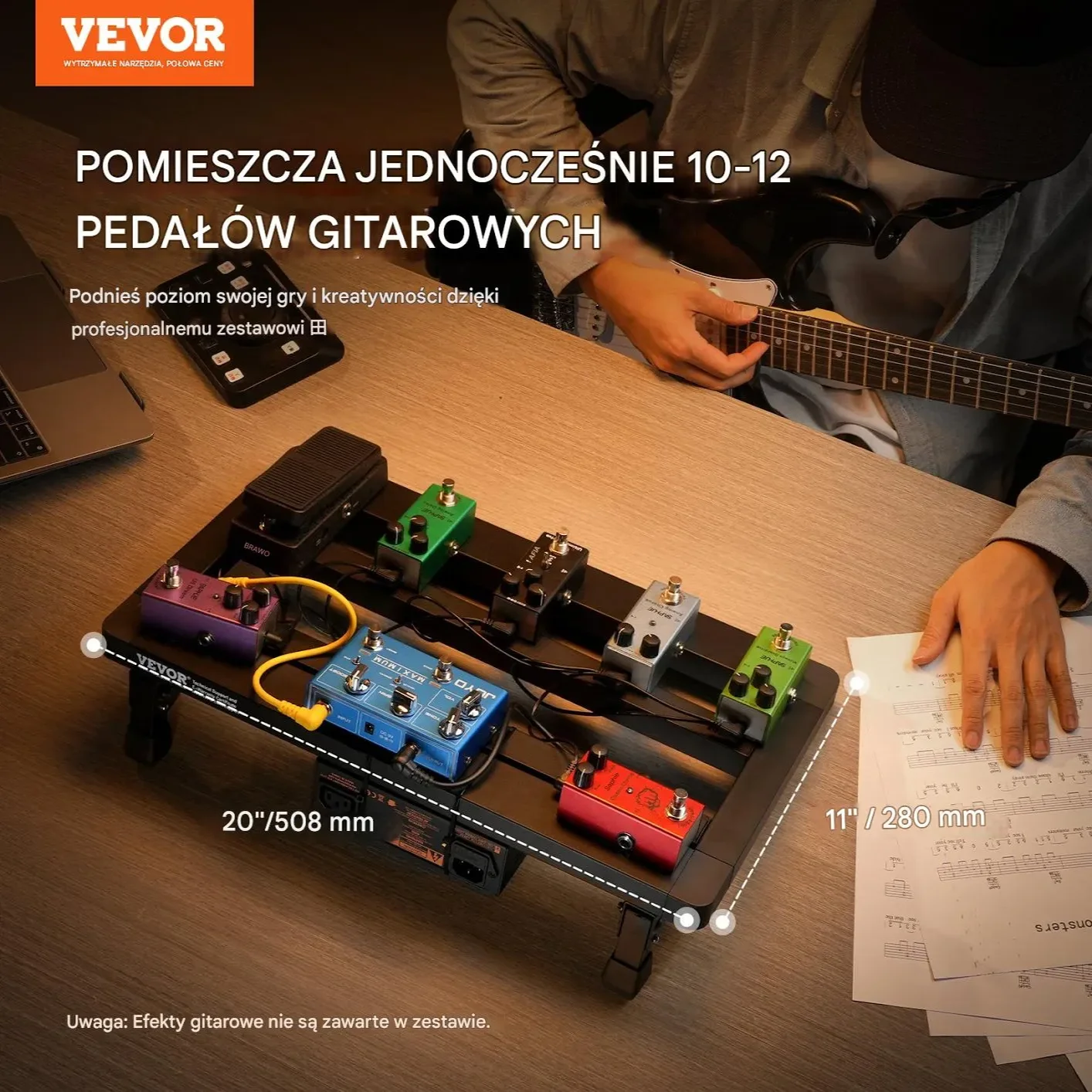 - ✅ Miejsce na 10–12 efektów – powierzchnia robocza 508 x 280 mm z przestrzenią na zasilacz pod spodem.