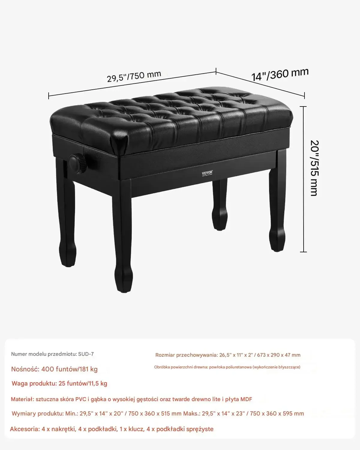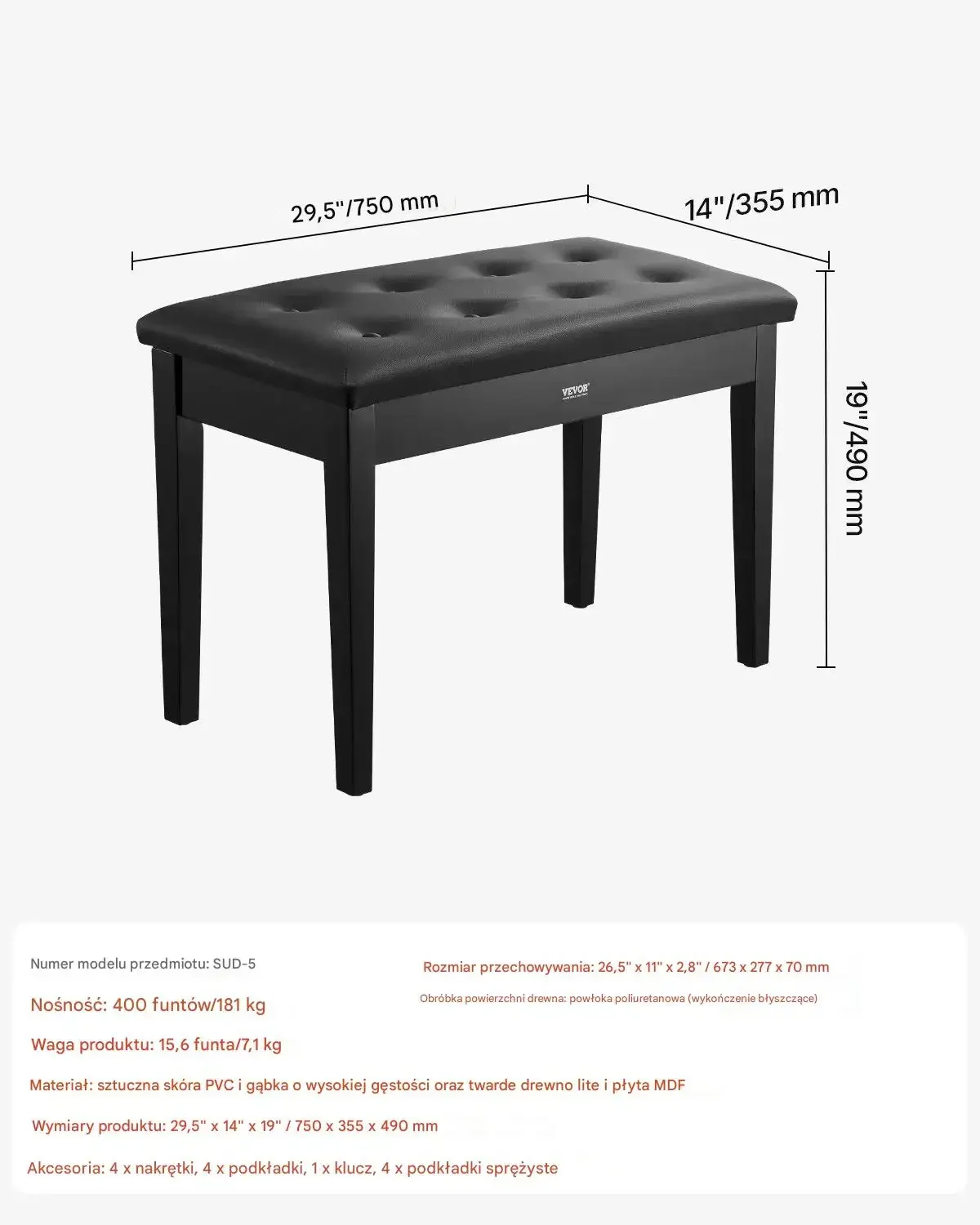 Ławka charakteryzuje się nośnością do 181 kg. Waga produktu wynosi 7,1 kg. Materiał wykonania to sztuczna skóra PVC, gąbka o wysokiej gęstości oraz twarde drewno lite i płyta MDF. Wymiary produktu to 750 mm (długość) x 355 mm (szerokość) x 490 mm (wysokość). Rozmiar przestrzeni do przechowywania to 67,3 cm x 27,7 cm x 7 cm. Obróbka powierzchni drewna to powłoka poliuretanowa z wykończeniem błyszczącym.
