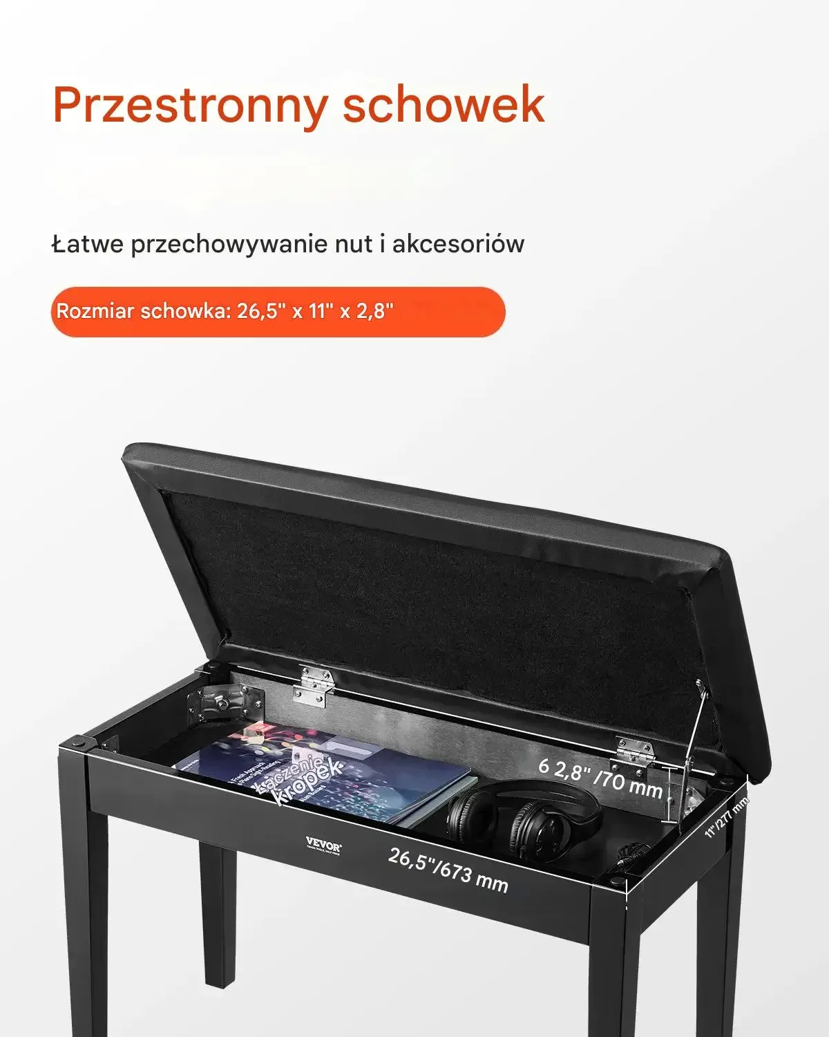 Ławka oferuje przestronny schowek, idealny do łatwego przechowywania nut i akcesoriów. Rozmiar schowka to 67,3 cm x 27,7 cm x 7 cm.