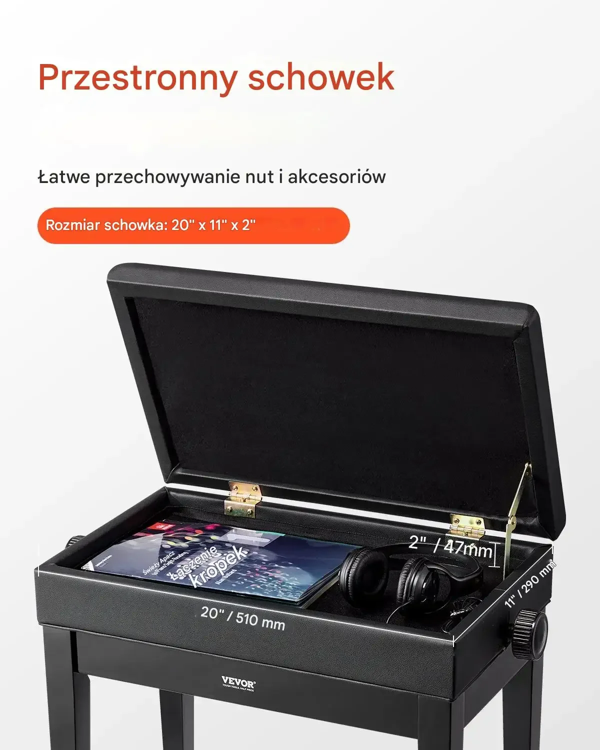 - ⭐ Organizacja akcesoriów muzycznych: Przestronny schowek pomaga utrzymać porządek w nutach, metronomach i innych drobiazgach.