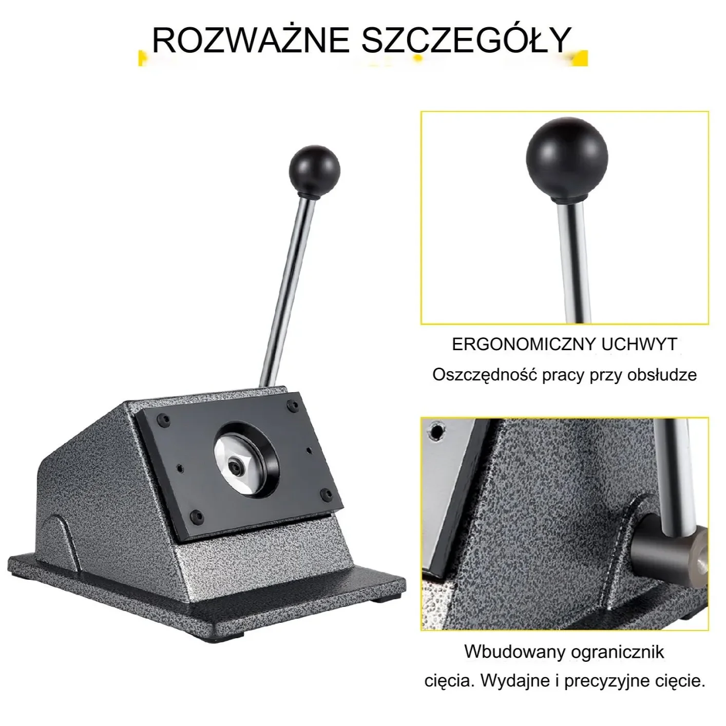 Dziurkacz graficzny jest wyposażony w ergonomiczny uchwyt, słupek ograniczający i cztery gumowe nóżki, które ułatwiają cięcie papieru bez wysiłku. Gdy nie można już nacisnąć uchwytu, papier został przycięty do idealnego rozmiaru.