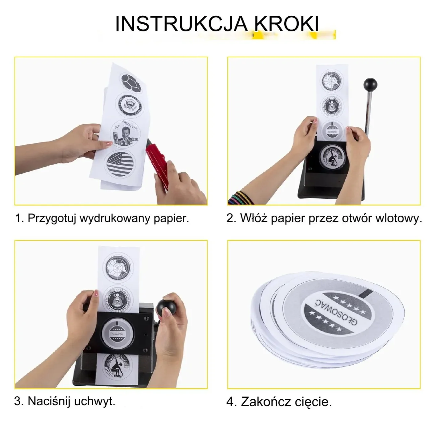Proces tworzenia guzików DIY jest łatwy do nauczenia się z tym wykrojnikiem. Do wykonania cięcia papieru wystarczą tylko dwa kroki.