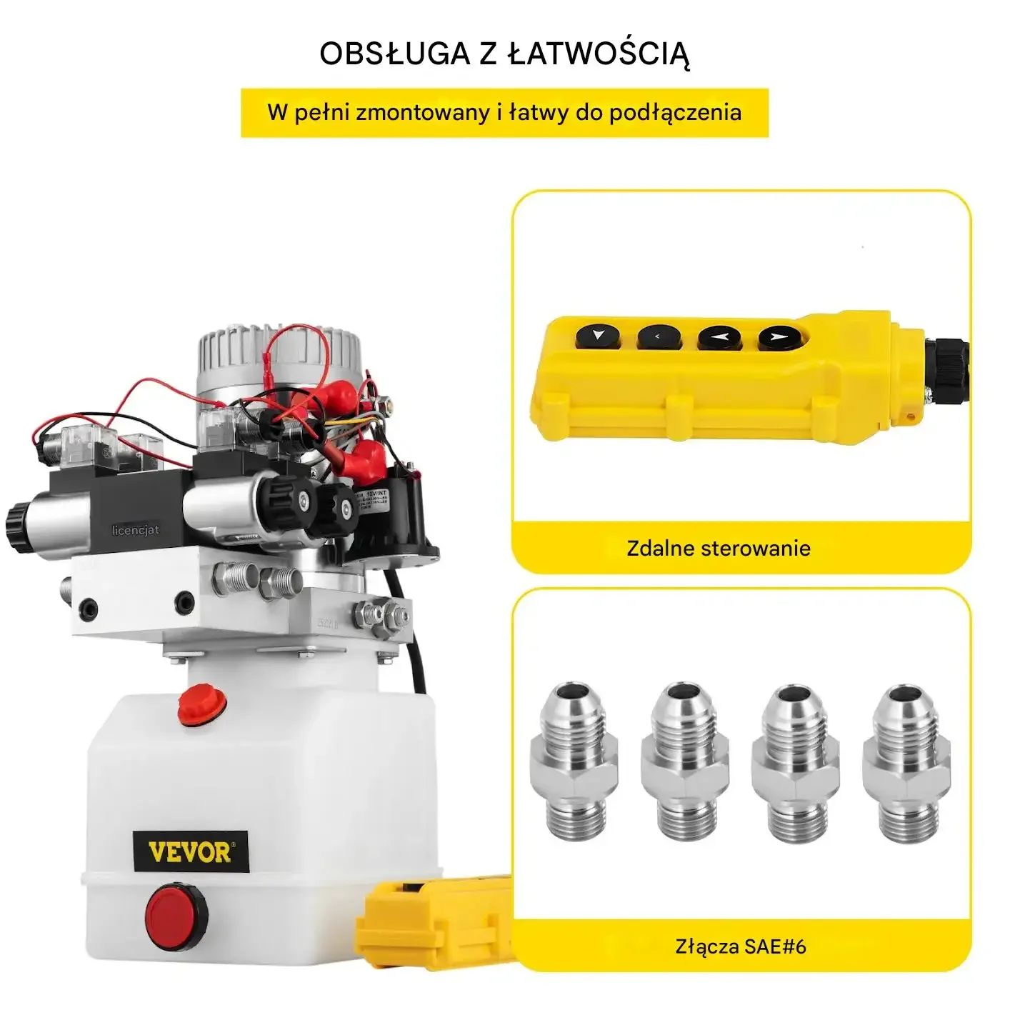 Pompa jest w pełni zmontowana i łatwa do podłączenia, co pozwala na obsługę z łatwością. W zestawie znajduje się pilot zdalnego sterowania oraz złącza SAE#6, niezbędne do prawidłowej instalacji i użytkowania agregatu hydraulicznego.