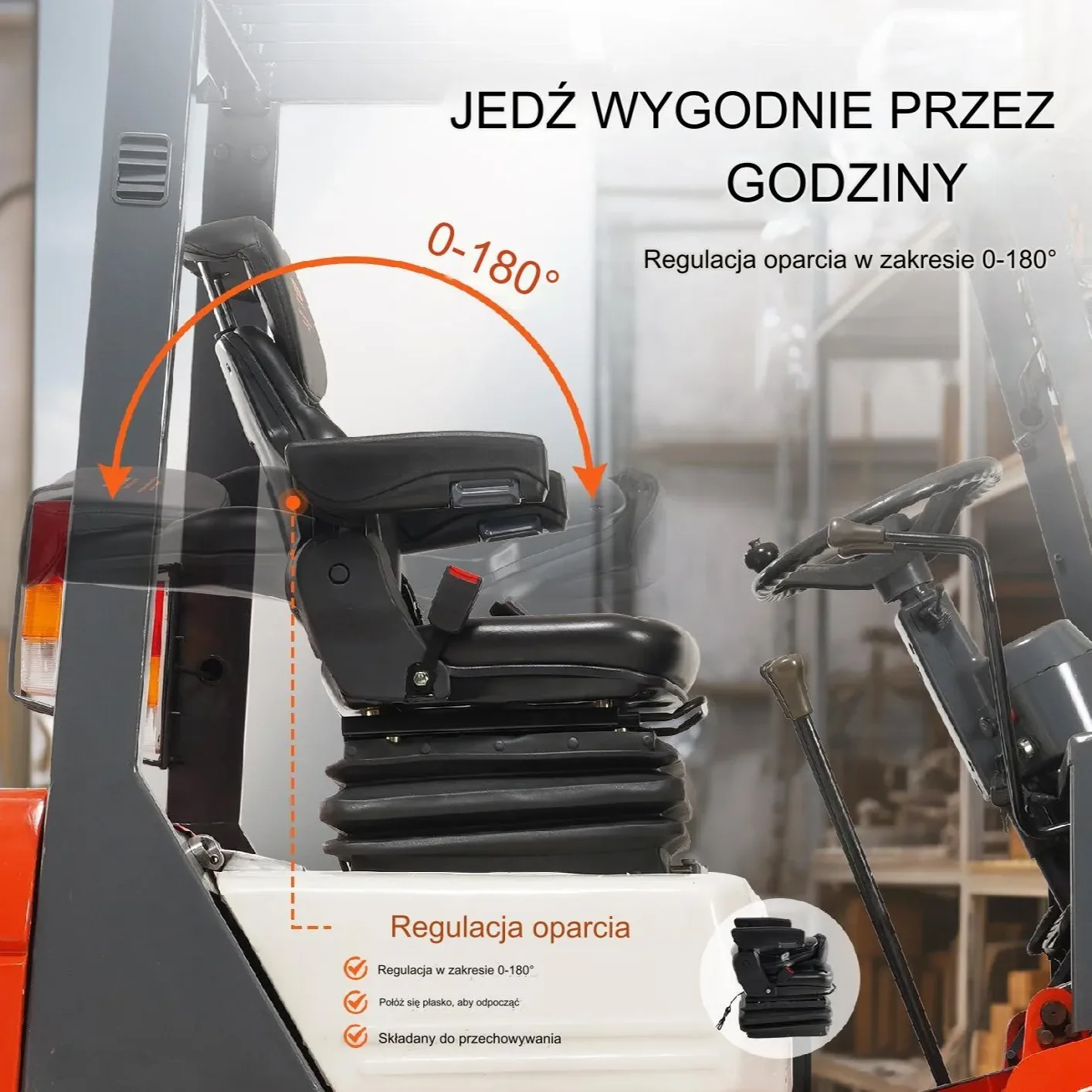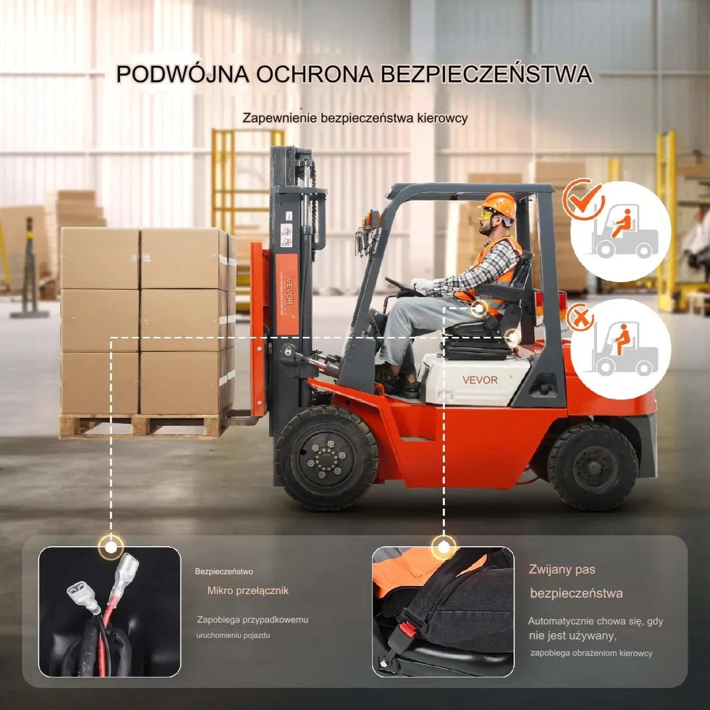- ✅ Dwupunktowy pas bezpieczeństwa: Zwijany pas z blokadą awaryjną pochłania energię uderzenia podczas kolizji, zwiększając bezpieczeństwo operatora.
