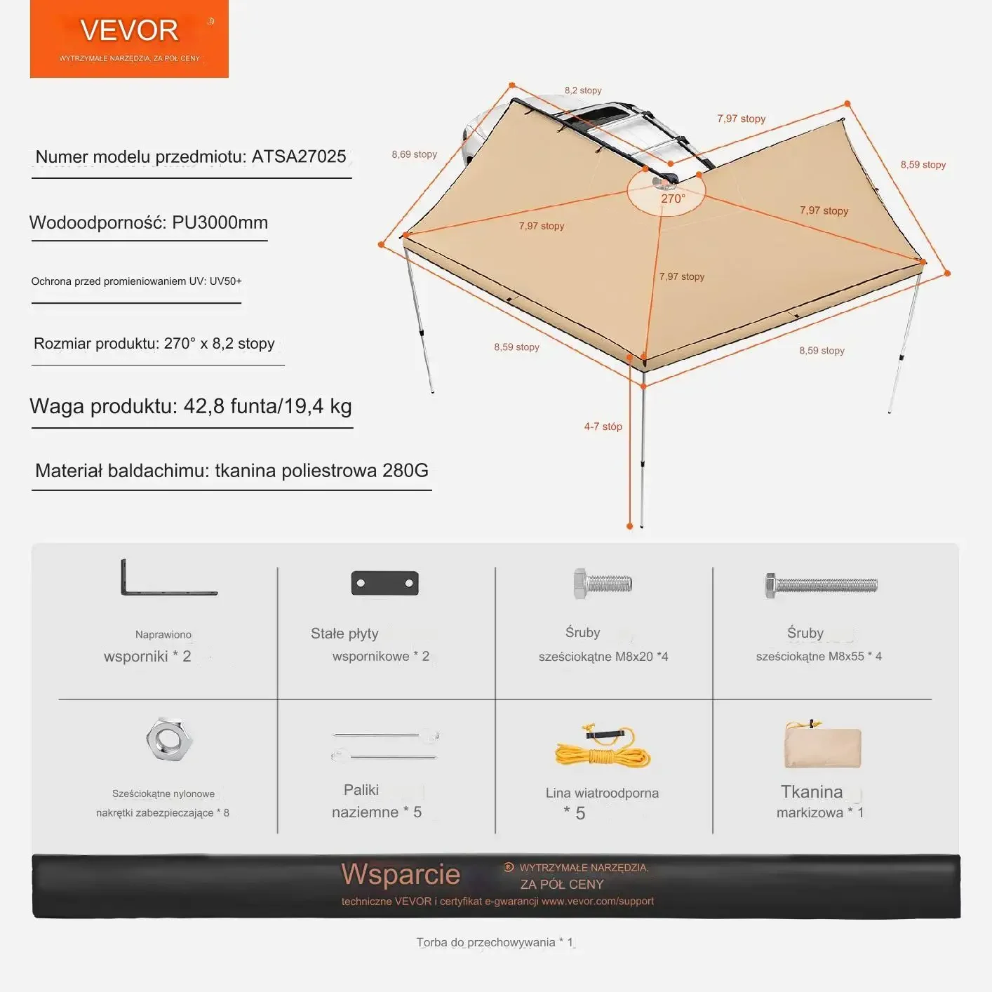 Instrukcja montażu obejmuje proste kroki: rozstawienie podpór i przytwierdzenie do pojazdu, rozciągnięcie tkaniny i zabezpieczenie linami i akcesoriami, aby zapewnić stabilność i ochronę przed warunkami atmosferycznymi. Zestaw zawiera wszystkie niezbędne elementy montażowe.