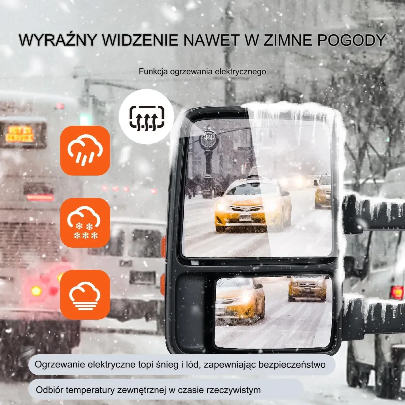 Te lusterka do samochodów ciężarowych zostały zaprojektowane z funkcją ręcznego składania teleskopowego, dzięki czemu ich przechowywanie jest dziecinnie proste i ułatwia przejście przez wąskie przestrzenie. Funkcja podgrzewania zapewnia szybkie usuwanie szronu lub mgły, zapewniając krystalicznie czyste widzenie, nawet w deszczowe i śnieżne dni.