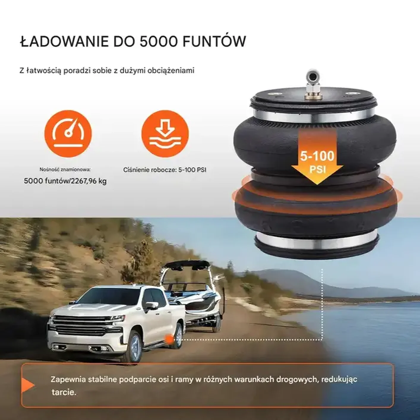 • Udźwig aż do 2268 kg: Zestaw zapewnia nośność do 5000 funtów, znacząco zwiększając stabilność pojazdu i redukując zużycie resorów piórowych.