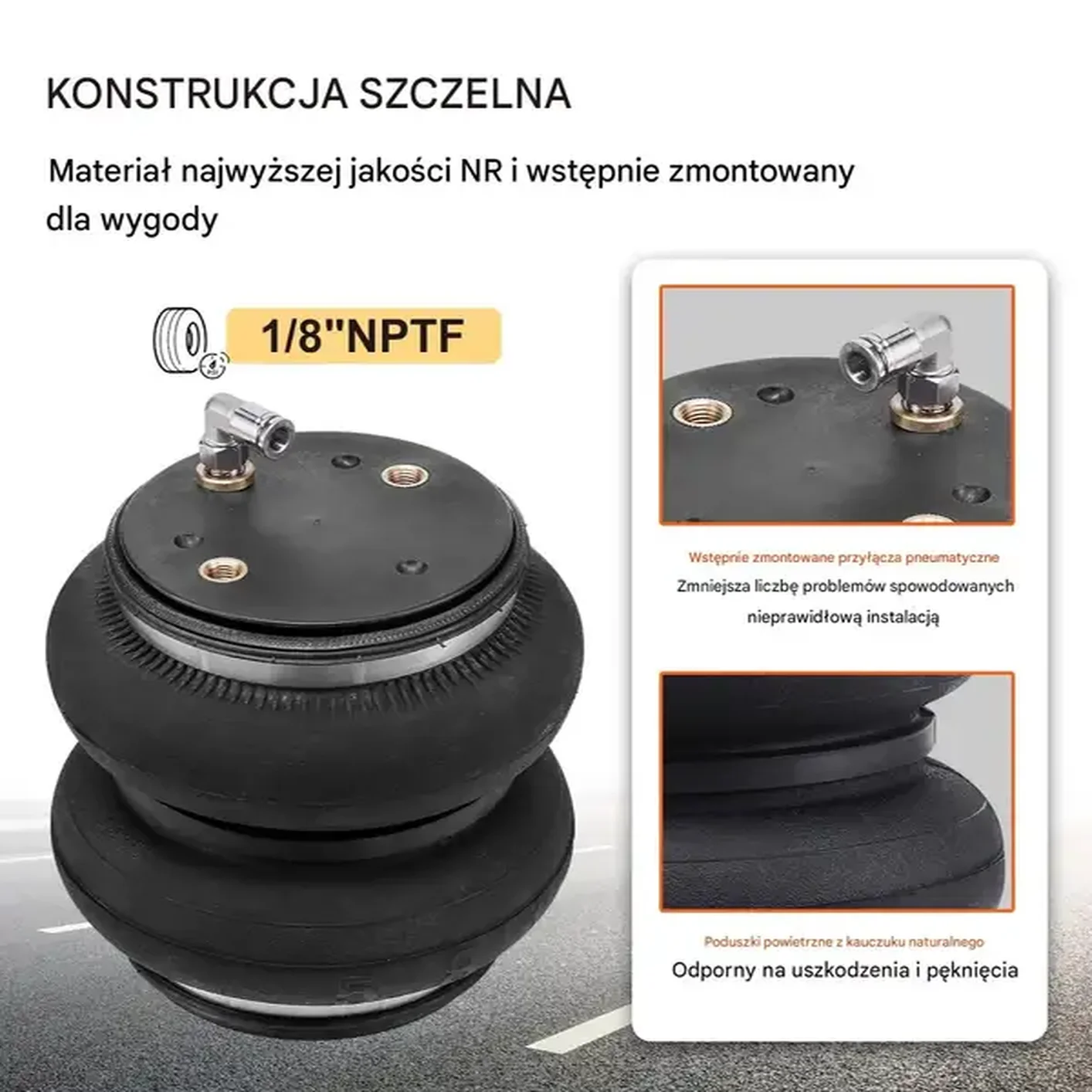 • Regulacja ciśnienia: Poduszki pracują w zakresie od 0,3 do 6,9 bara (5–100 PSI), co pozwala dopasować zawieszenie do obciążenia i rodzaju nawierzchni.