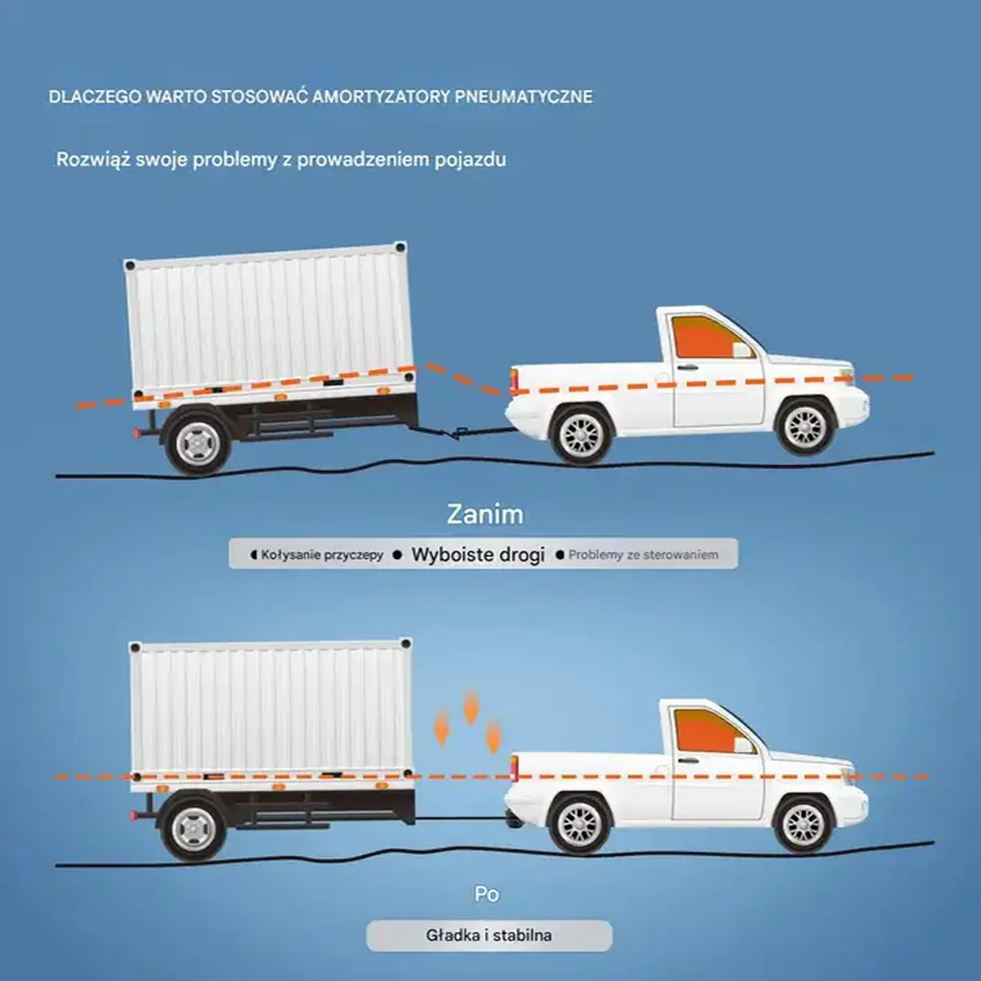 • Komfort i stabilność jazdy: Zestaw eliminuje efekt dobicia osi, minimalizuje wibracje i poprawia jakość prowadzenia nawet przy dużym obciążeniu.