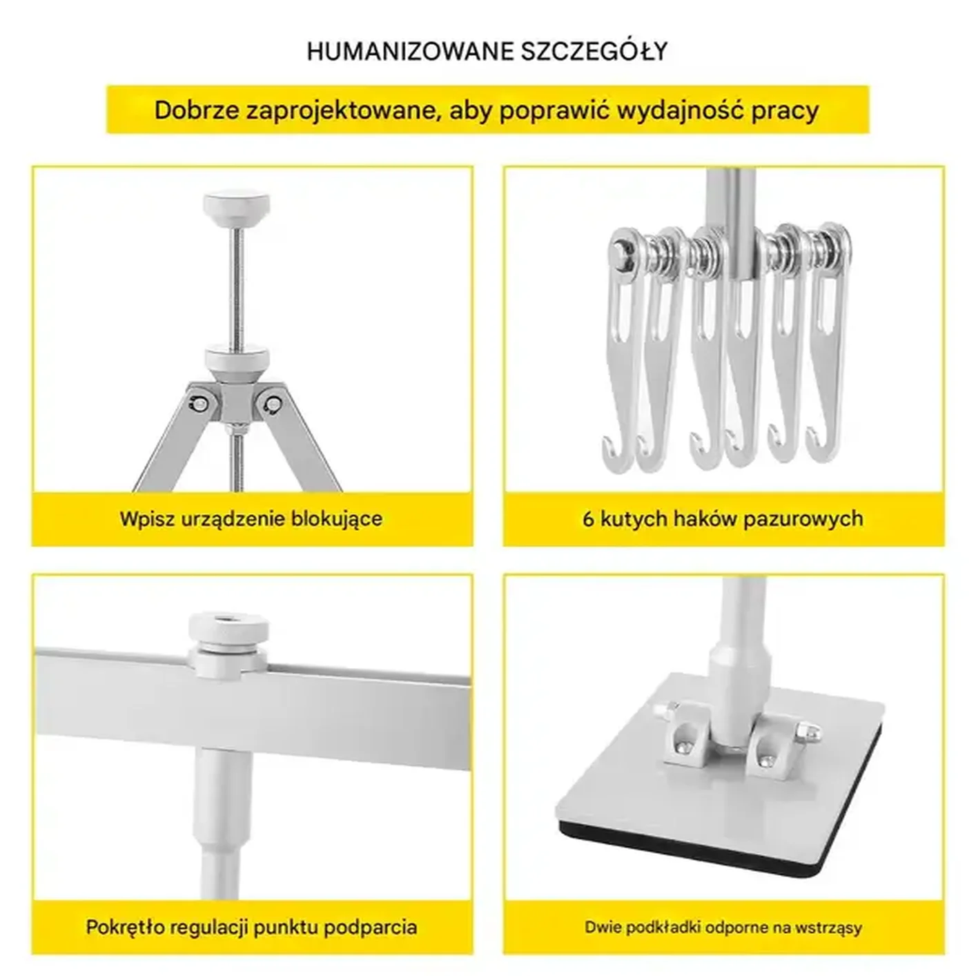 • ➡️ Bezpieczeństwo pracy: Stabilne podparcie i antypoślizgowe stopy chronią powierzchnię przed uszkodzeniem