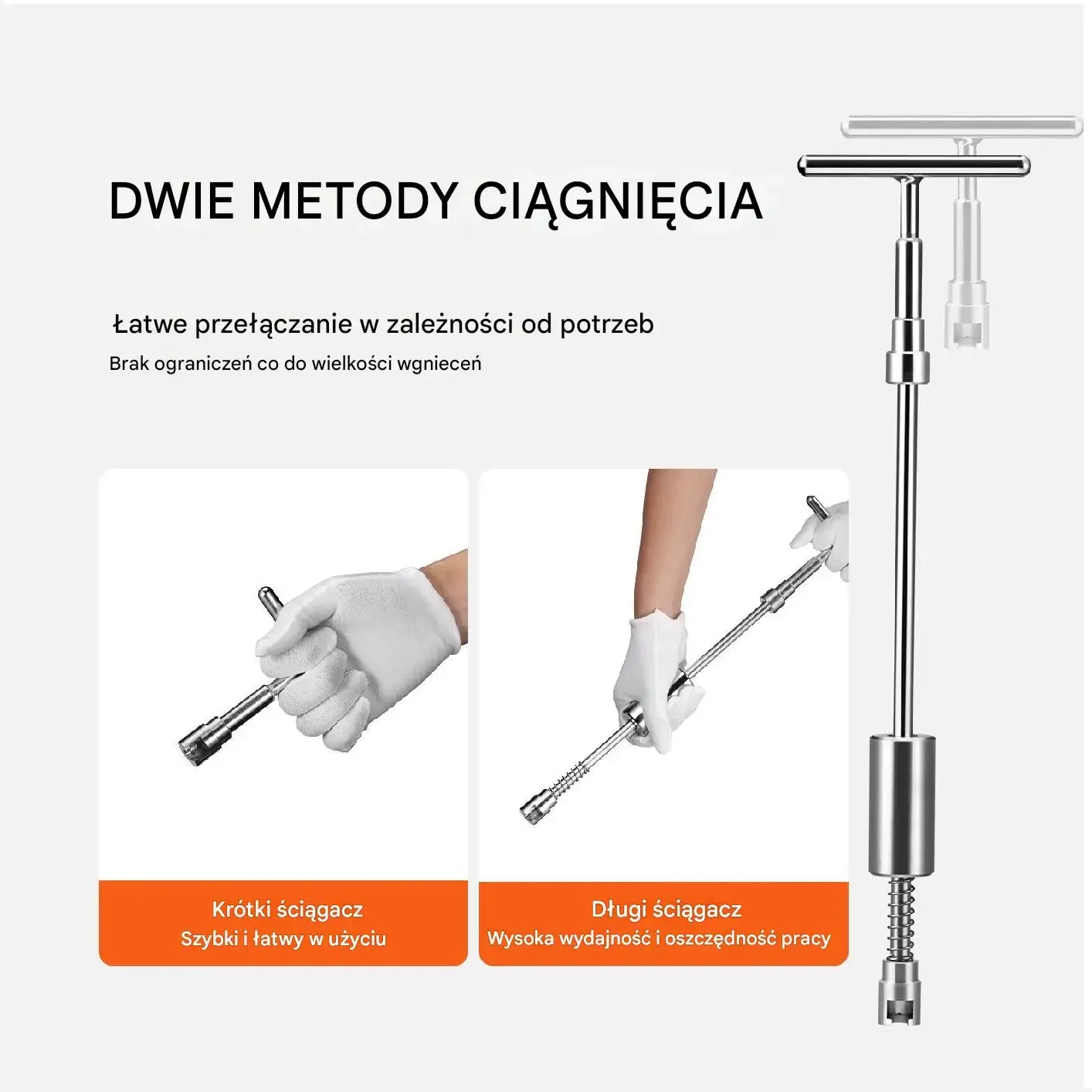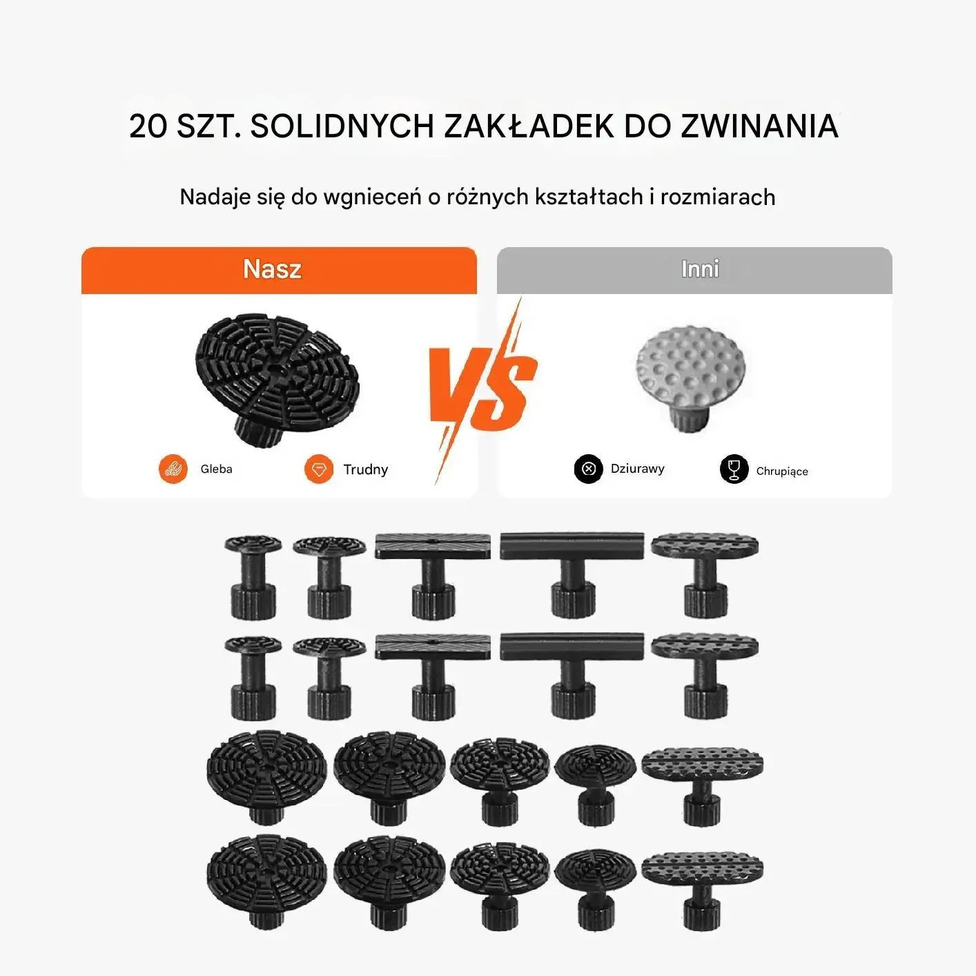 Dwie metody ciągnięcia: krótki ściągacz — szybki i łatwy w użyciu; długi ściągacz — wysoka wydajność i oszczędność pracy. Zestaw zawiera 20 sztuk solidnych zakładek do zginania/ciągnięcia, które nadają się do wgnieceń o różnych kształtach i rozmiarach. (Na grafikach podano również porównanie nakładek: „Nasz” vs „Inni”).