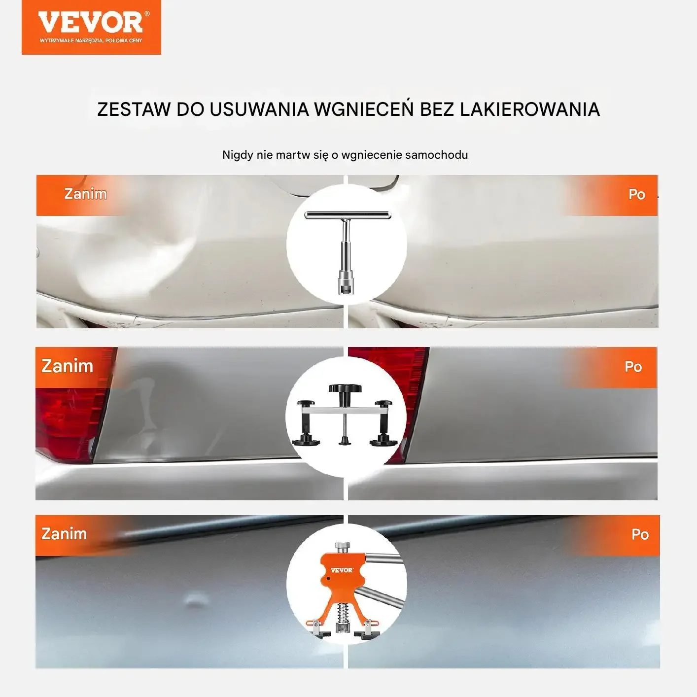 Zestaw do usuwania wgnieceń bez lakierowania. Nigdy nie martw się o wgniecenie samochodu. Przykładowe efekty „Zanim” → „Po” pokazują naprawy różnych wgnieceń przy użyciu dołączonych narzędzi.