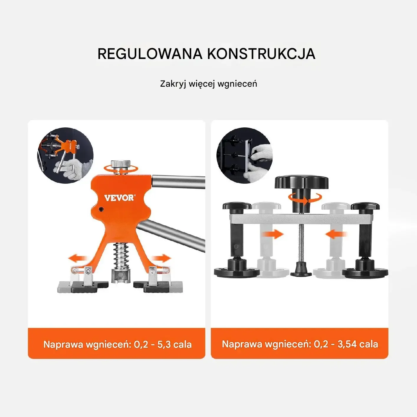 Regulowana konstrukcja umożliwia zakrycie większej liczby wgnieceń. Naprawa wgnieceń: 0,2–5,3 cala oraz 0,2–3,54 cala (wartości podane na grafikach). Elementy konstrukcyjne są regulowane, co pozwala dostosować narzędzie do różnych rozmiarów i kształtów wgnieceń.