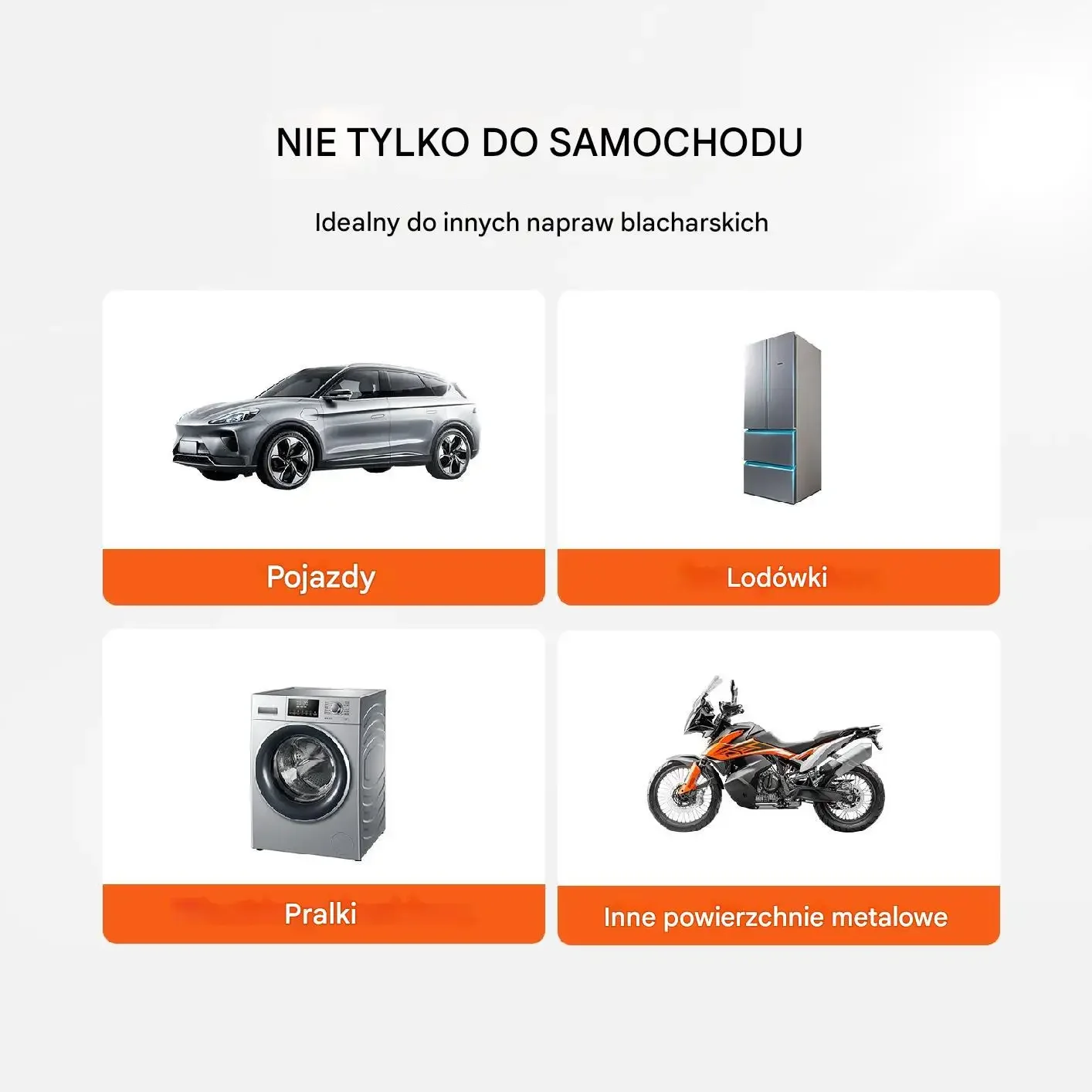 Nie tylko do samochodu. Zestaw nadaje się do napraw blacharskich na pojazdach, lodówkach, pralkach oraz innych powierzchniach metalowych.