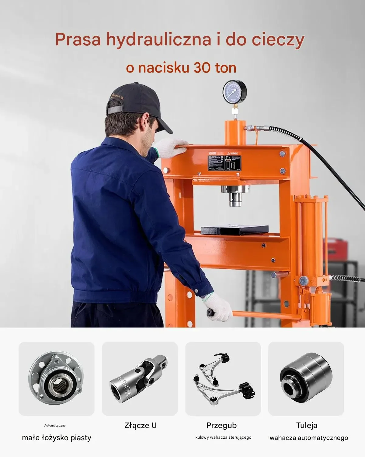 - ✅ Ogromna siła nacisku: Udźwig do 30 ton umożliwia bezproblemowe wciskanie i wyciskanie tulei, łożysk, sworzni kulowych oraz innych elementów metalowych