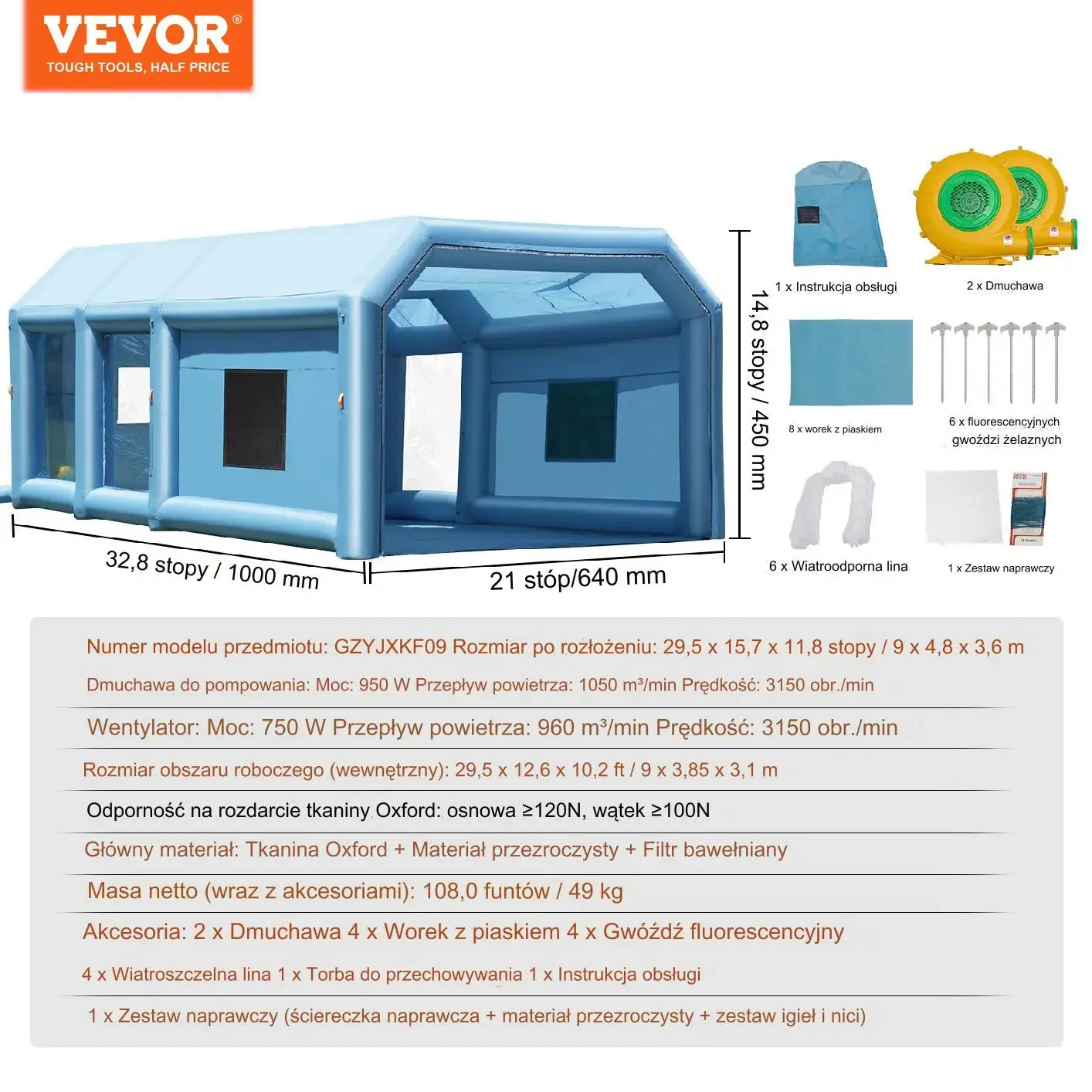 Kabina lakiernicza jest dostarczana z kompletnym zestawem akcesoriów, w tym torbą do przechowywania, dmuchawa o mocy 680 W, dmuchawa wentylacyjna o mocy 330 W, liny, kołki, worki z piaskiem i łatki naprawcze.