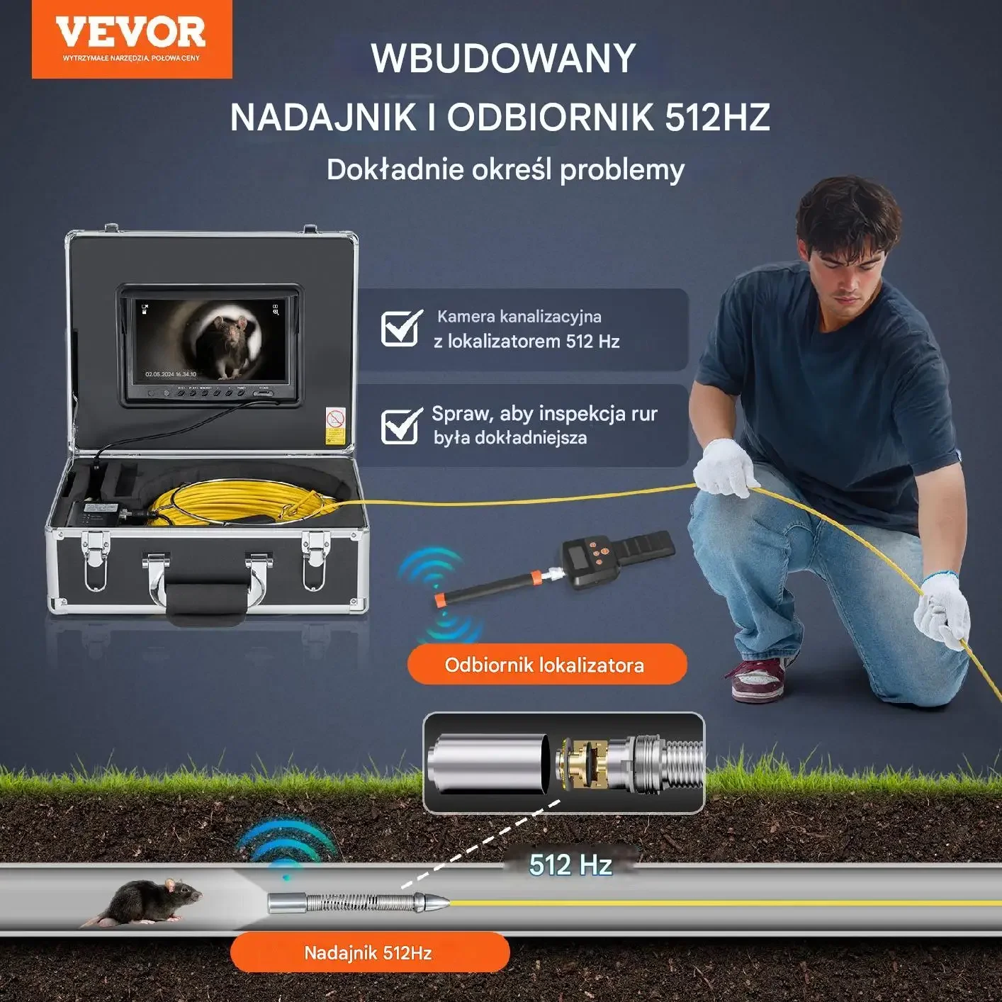 - ✅ Szybkie i precyzyjne lokalizowanie problemów: Wyposażona w lokalizator z odbiornikiem 512 Hz, kamera precyzyjnie lokalizuje problemy w systemie kanalizacyjnym. Oznaczenia co 0,9 m na kablu umożliwiają śledzenie głębokości wprowadzenia kamery, co usprawnia inspekcje i diagnozowanie blokad w rurach.