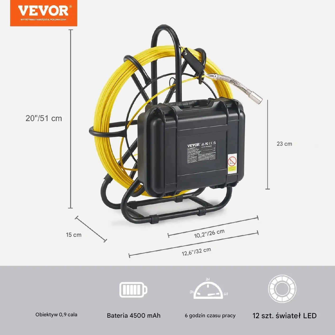 - ✅ Solidny półsztywny kabel: Kabel o długości 50 m wykonany z wytrzymałego włókna szklanego pokonuje zakręty i długie odcinki rur. Jest odporny na wilgoć, ciemność i trudne warunki pracy. Oznaczenia co 0,9 m pozwalają na dokładne śledzenie głębokości inspekcji. Kompatybilny z rurami o średnicach 25–150 mm.