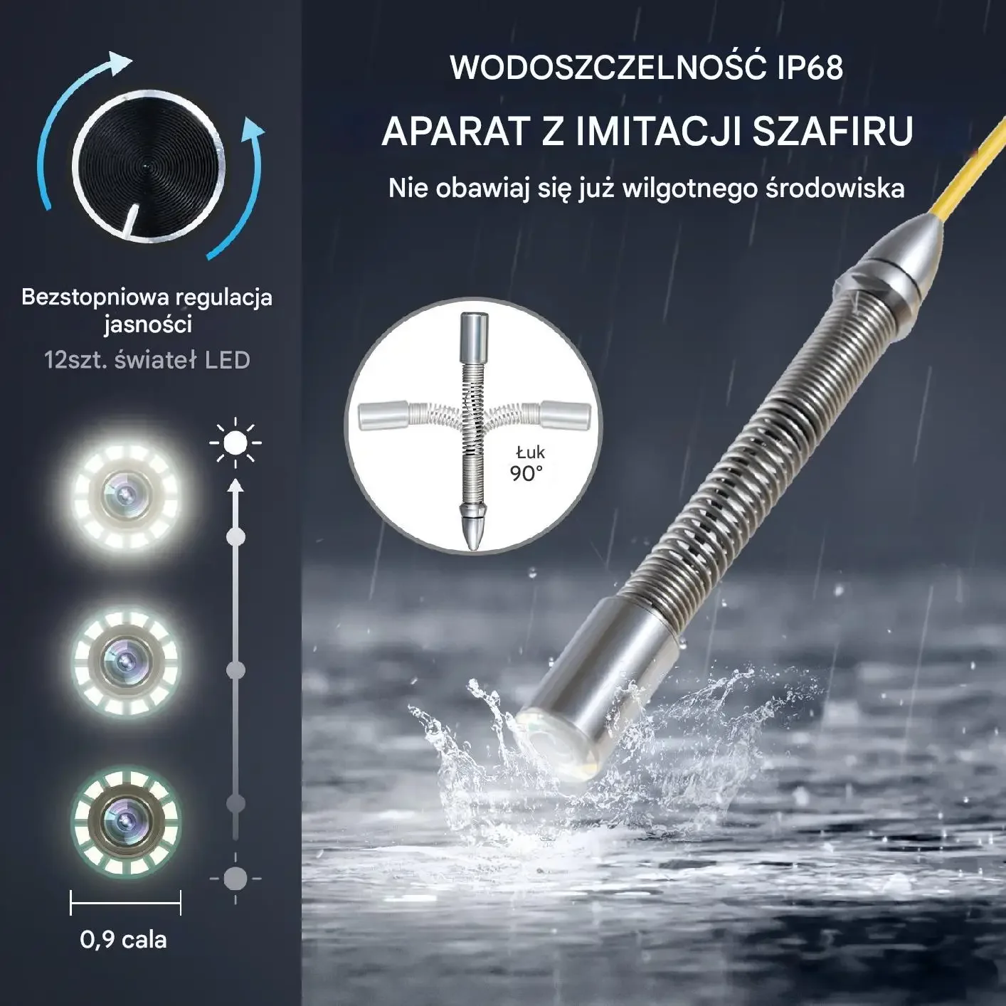 Bezstopniowa regulacja jasności. 12 sztuk świateł LED. Średnica głowicy kamery: 0,9 cala. Wodoszczelność IP68. Aparat z imitacji szafiru. Nie obawiaj się wilgotnego środowiska. Głowica z możliwością zgięcia pod kątem 90°.