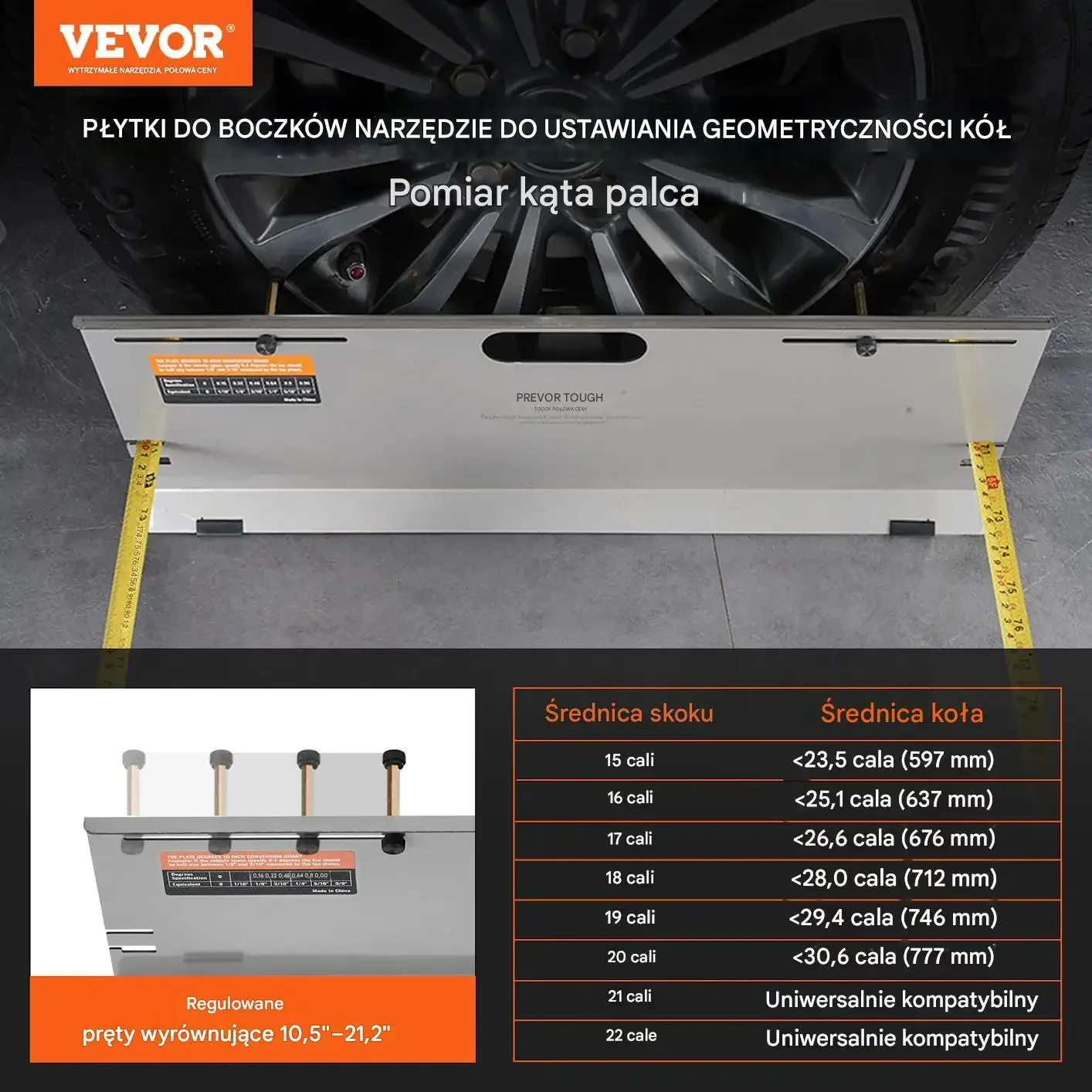 - ✅ Precyzyjny pomiar kąta zbieżności: Bez konieczności demontażu opon, bezpośredni pomiar na piaście z regulowanymi prętami (26,67-53,85 cm). Minimalizuje niedokładności spowodowane nierównościami opon.