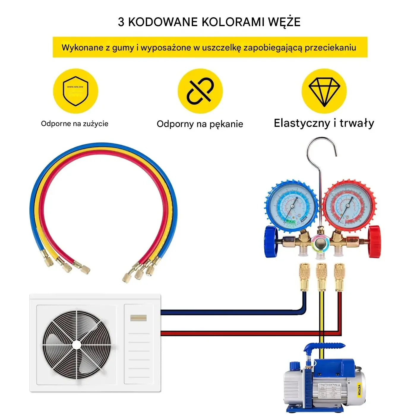 Trzy węże kodowane kolorami, wykonane z gumy i wyposażone w uszczelkę zapobiegającą przeciekaniu. Węże są odporne na zużycie, odporne na pękanie, elastyczne i trwałe.