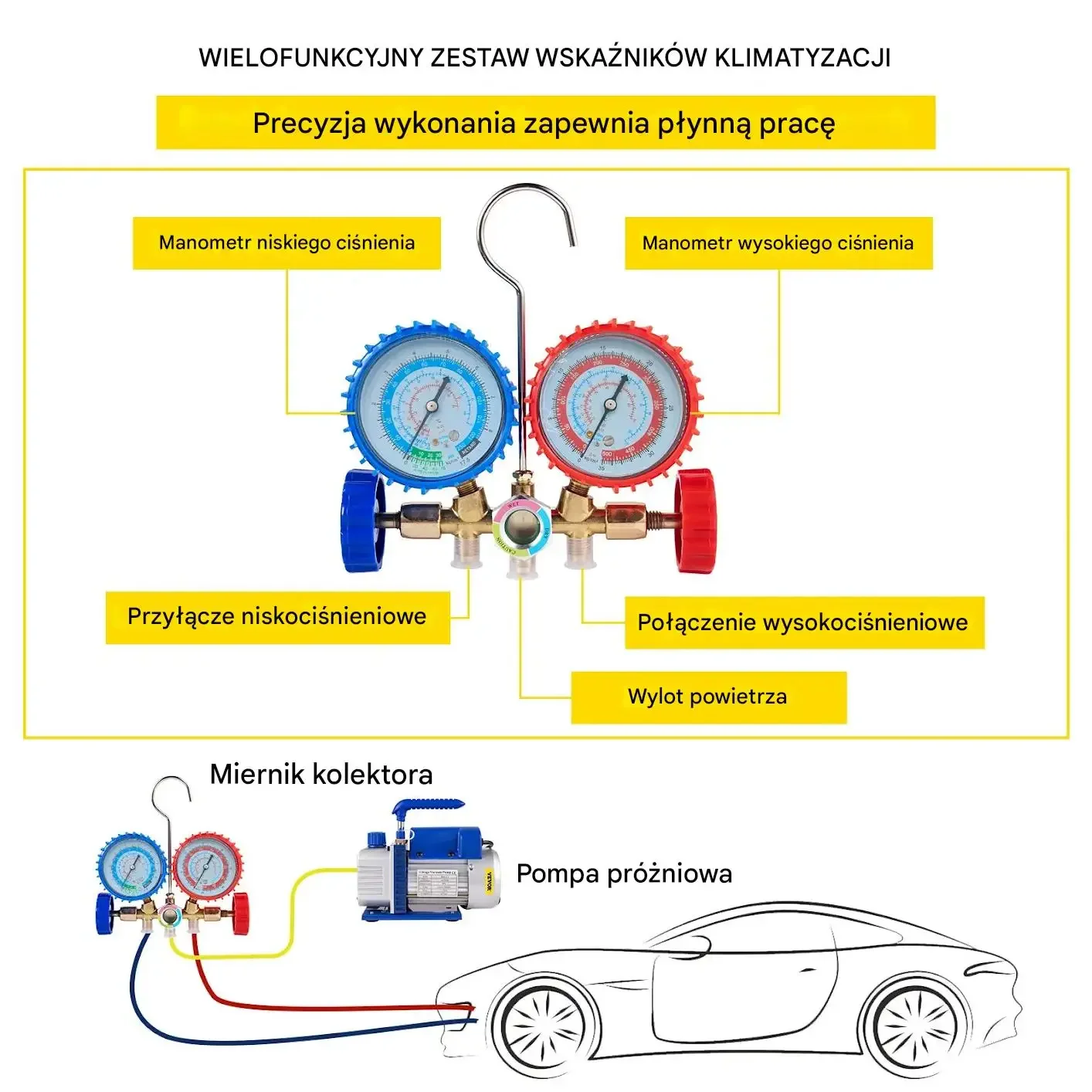 Wielofunkcyjny zestaw wskaźników klimatyzacji. Precyzja wykonania zapewnia płynną pracę. Zestaw zawiera manometr niskiego ciśnienia, manometr wysokiego ciśnienia, przyłącze niskociśnieniowe, połączenie wysokociśnieniowe oraz wylot powietrza. W komplecie znajduje się miernik kolektora oraz pompa próżniowa do podłączenia m.in. do układu klimatyzacji samochodowej.