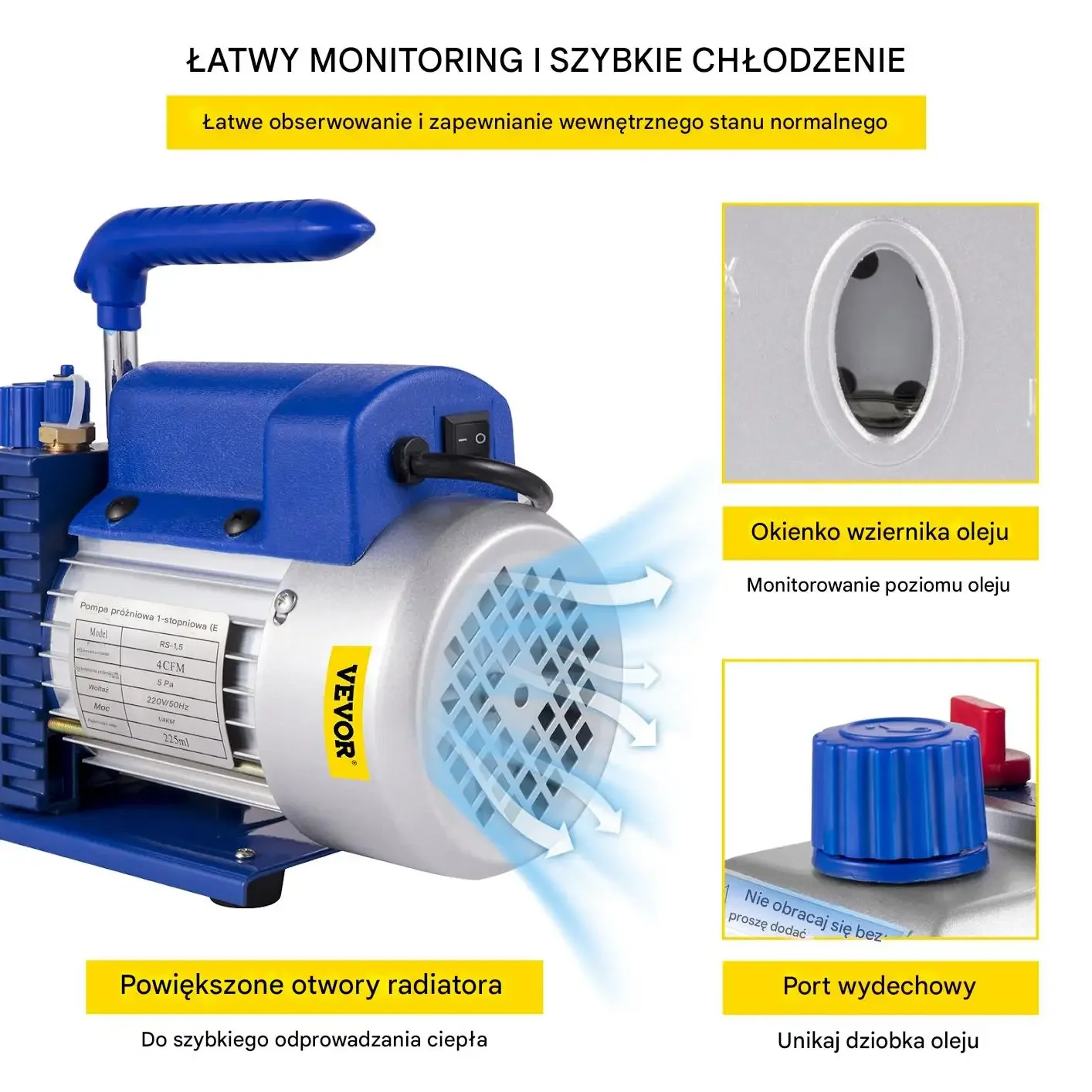 Pompa próżniowa jednowentylowa, model RS-1.5, wydajność 4 CFM. Zasilanie 220 V / 50 Hz. Pojemność oleju 225 ml. Dodatkowe cechy: powiększone otwory radiatora do szybkiego odprowadzania ciepła, okienko wziernika do monitorowania poziomu oleju oraz port wydechowy.