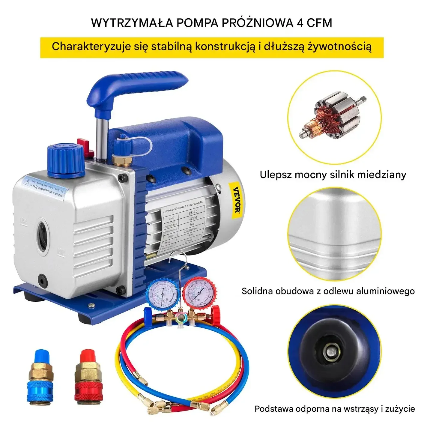 Pompa Próżniowa 4 CFM 1/3 HP do Klimatyzacji + Manometry i Węże – Profesjonalny Zestaw HVAC 220V