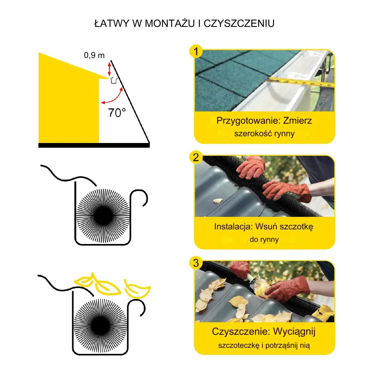 - ✅ Łatwa instalacja – bez potrzeby użycia narzędzi, wystarczy wsunąć szczotkę do rynny