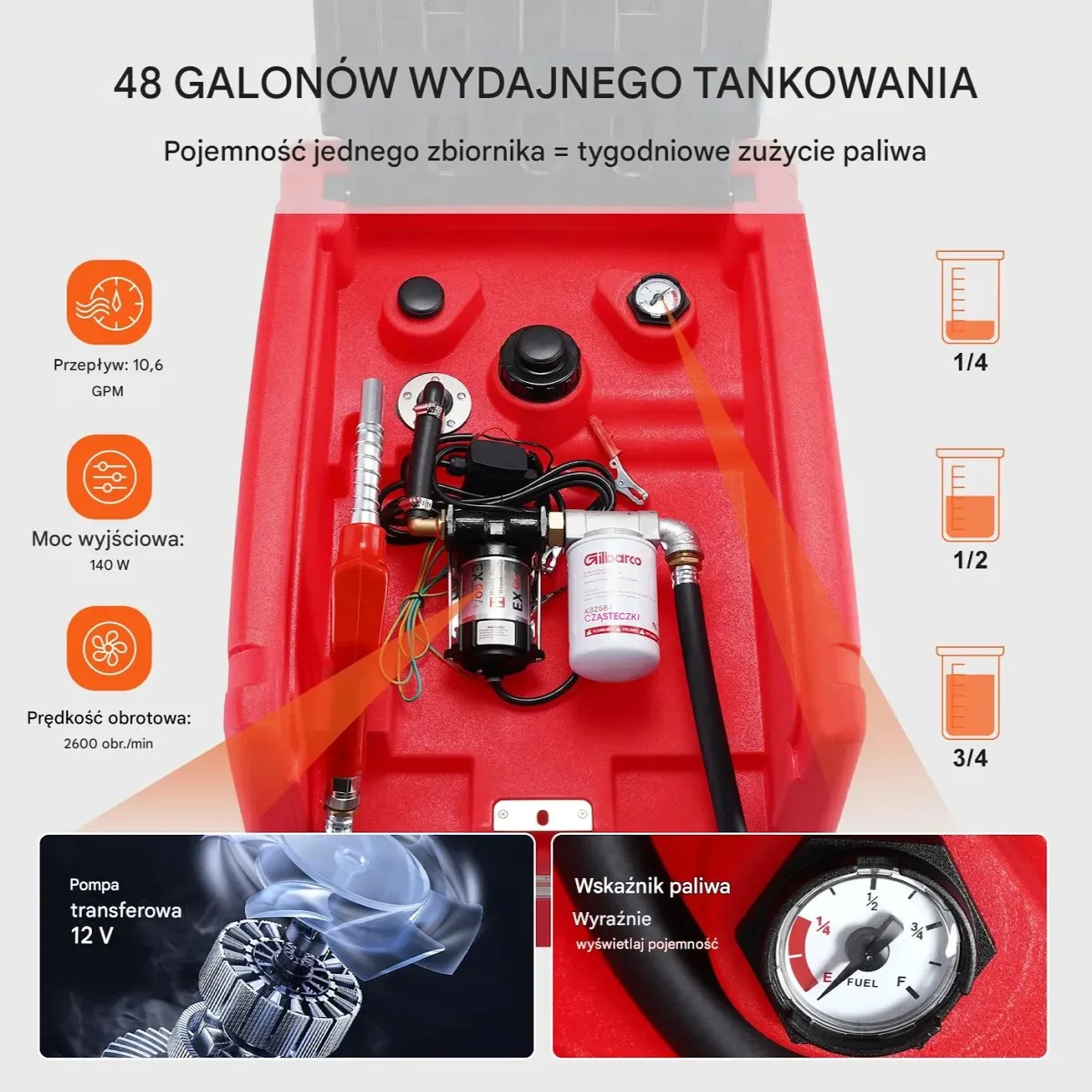 - ✅ Wskaźnik mechaniczny: Monitoruje poziom paliwa w czasie rzeczywistym, przypominając o konieczności uzupełnienia, z 8-poziomową skalą dla precyzyjnej kontroli