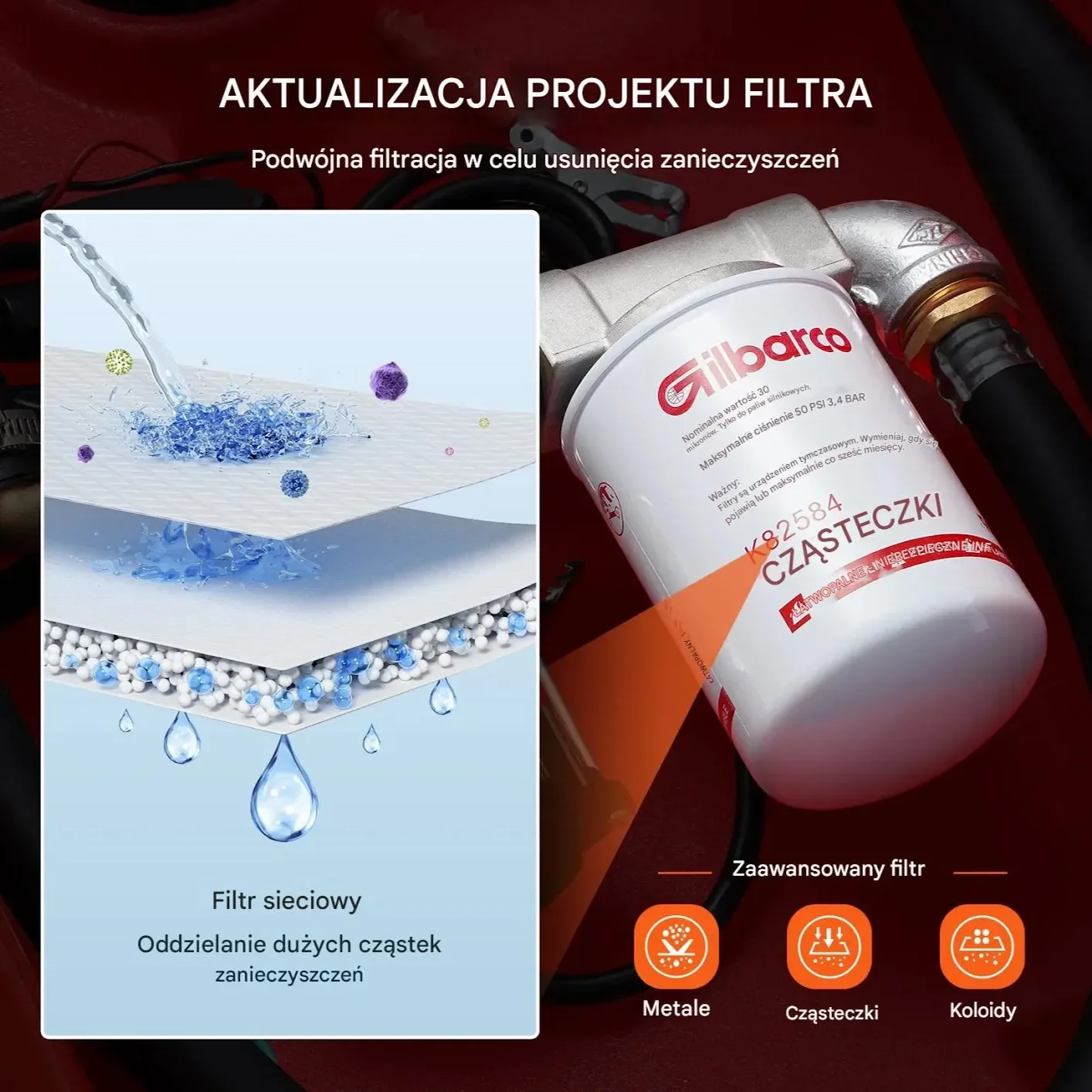 - ✅ Zaawansowany system filtracji: Podwójny filtr z wewnętrzną siatką oddzielającą duże zanieczyszczenia i zewnętrznym filtrem usuwającym małe cząstki jak metal, koloidy czy drobiny