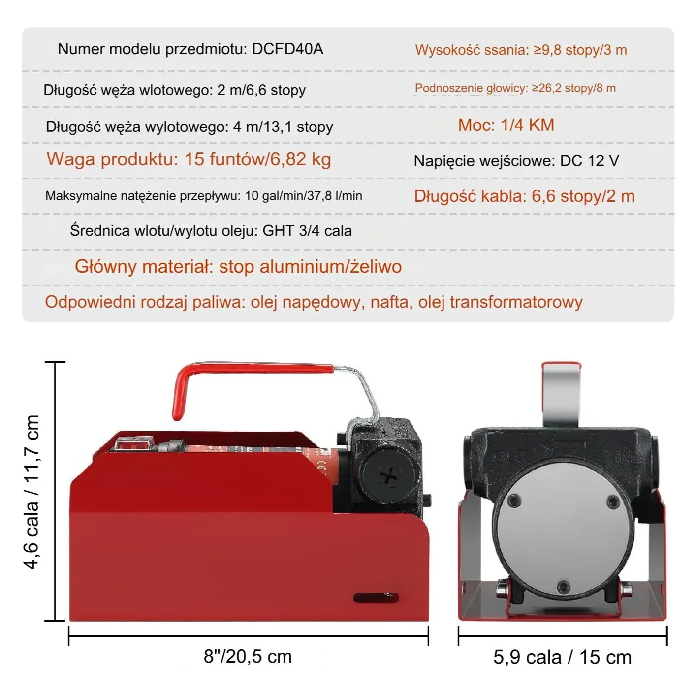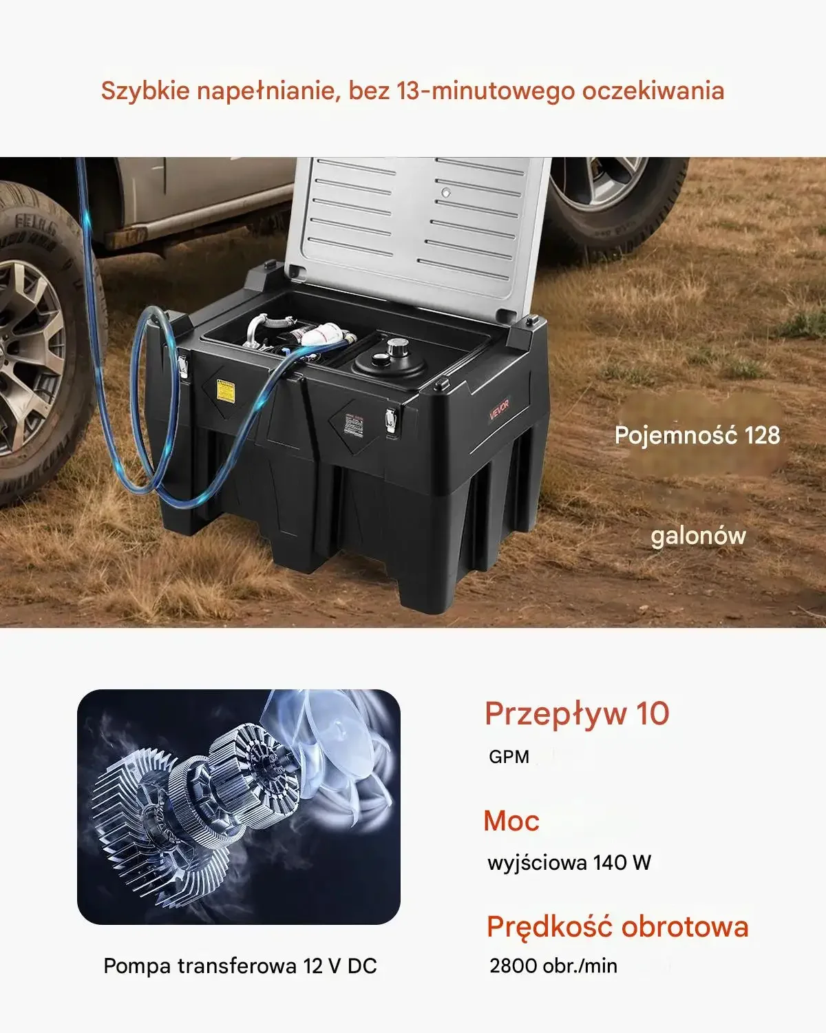 - ✅ Wydajna pompa transferowa 12 V: przepływ 10 gal/min czyli ok. 37,9 l/min oraz moc 140 W dla szybkich uzupełnień