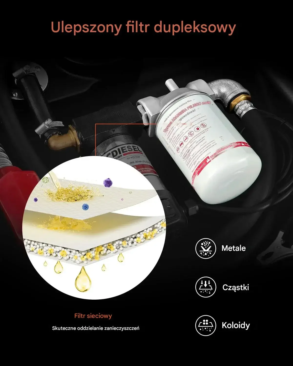 - ✅ Podwójny filtr (duplex): czyściejsze paliwo dzięki filtracji zanieczyszczeń grubych i drobnych
