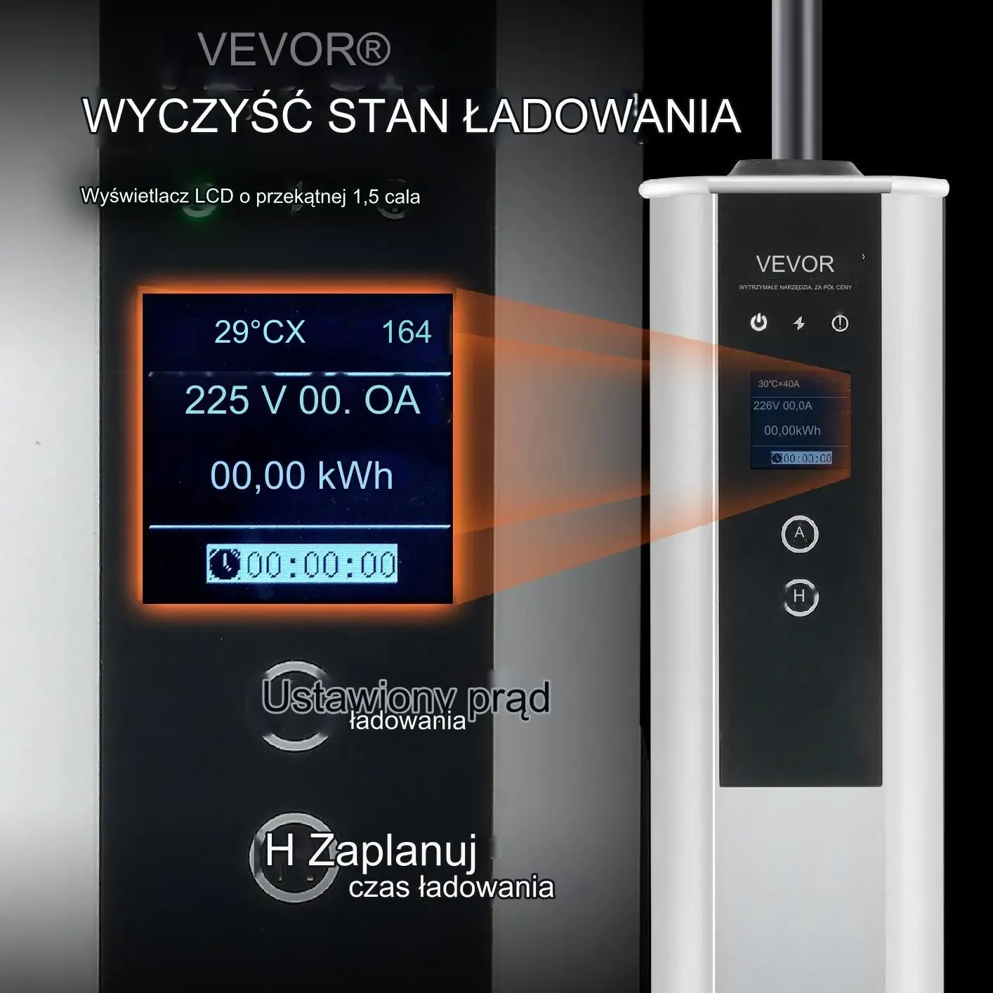 - ✅ Ekran LCD i aplikacja – regulacja prądu (8-16 A) i planowanie 1-12 h.