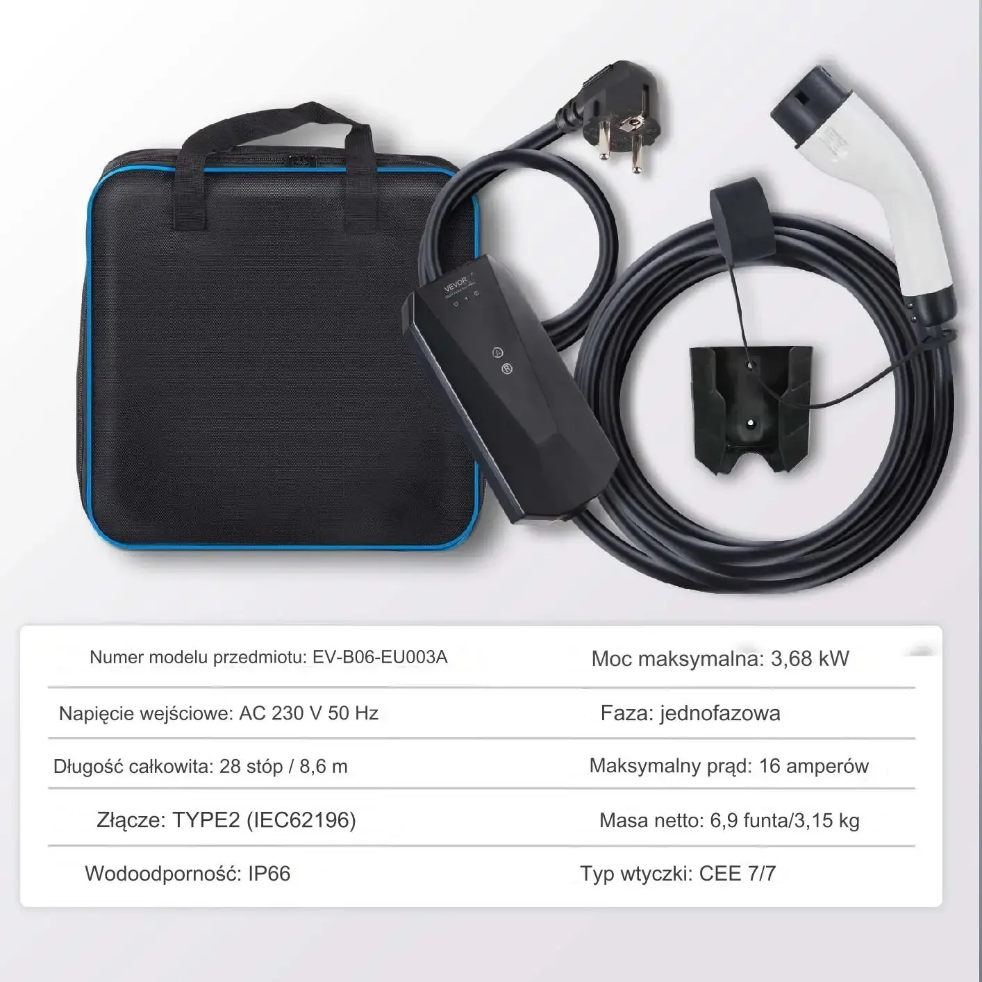 Poznaj przenośną ładowarkę EV o mocy do 11 kW z kablem 7,5 m! Wyposażona w ekran LCD, aplikację do sterowania i obudowę z aluminium, zapewnia szybkie i bezpieczne ładowanie pojazdów elektrycznych Typ 2, zarówno w domu, jak i w podróży.