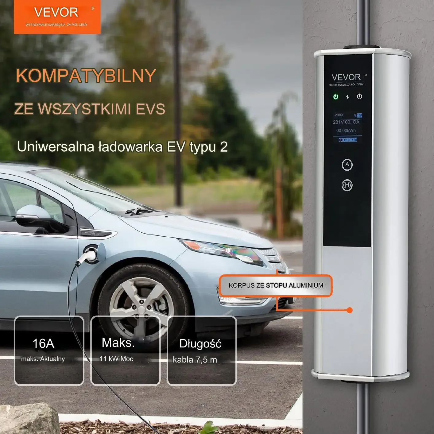- ✅ Kompatybilność – Typ 2 (IEC 62196) i wtyczka CEE 16 dla większości EV.