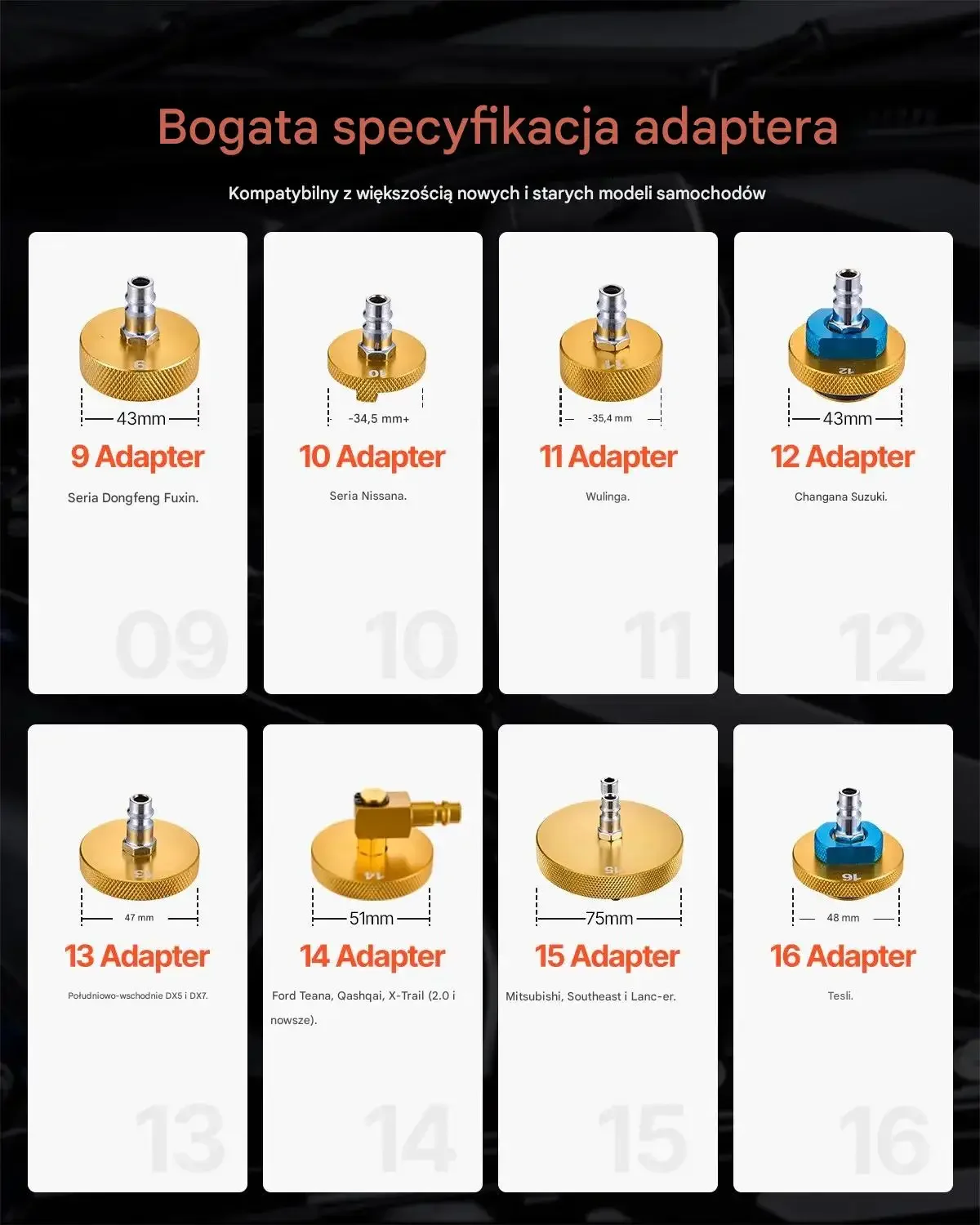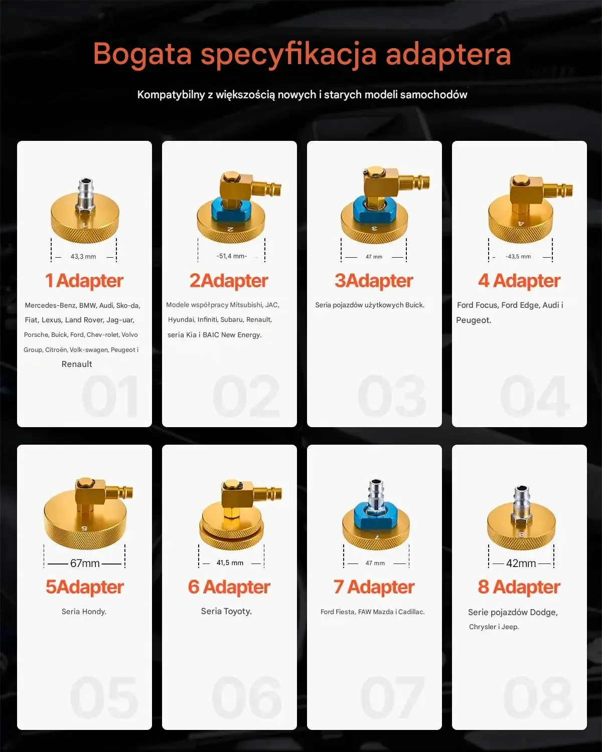 Bogata specyfikacja adaptera obejmuje różne rozmiary, takie jak: 43 mm, 34,5 mm, 47 mm, 51 mm, 75 mm, oraz 48 mm, odpowiadające rozmaitym markom samochodów i modelom.