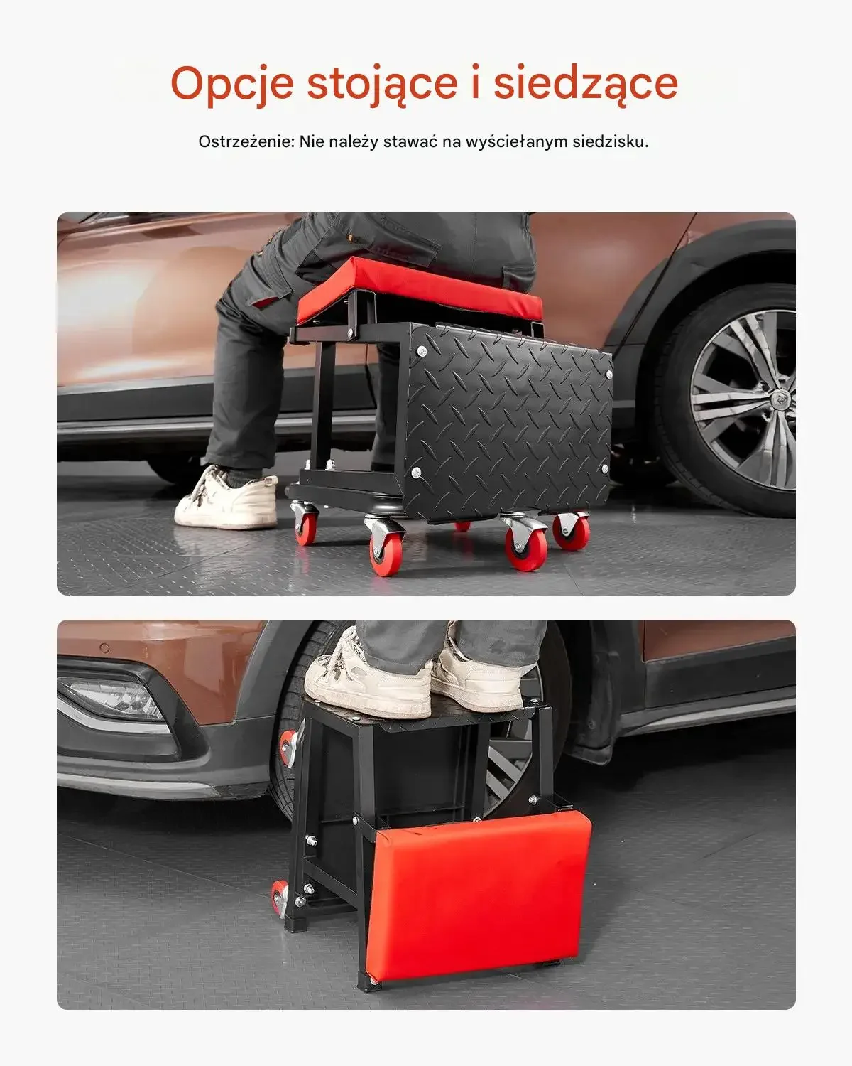 Wózek warsztatowy może być używany w trybie stojącym lub siedzącym do pracy przy samochodzie, zapewniając miejsce na narzędzia oraz wygodne przemieszczanie.
