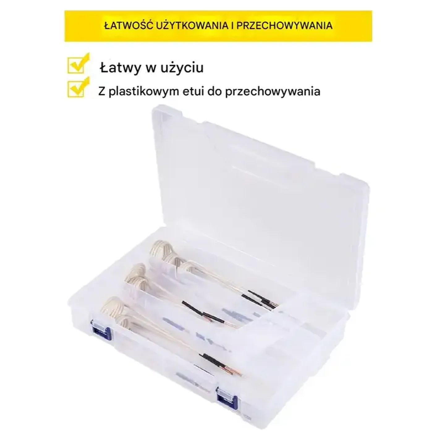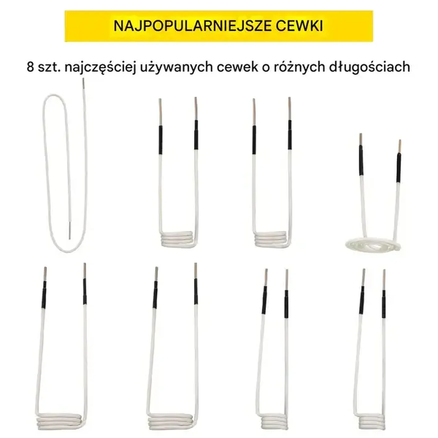 Cewki indukcyjne z tego zestawu są wyjątkowo elastyczne, co pozwala na łatwe dostosowanie ich do różnych zastosowań. Można je wyginać w dowolny sposób, aby idealnie pasowały do miejsca pracy. Dzięki tej właściwości, użytkownicy mogą uzyskać optymalne rezultaty, niezależnie od kształtu lub lokalizacji zapieczonego elementu.