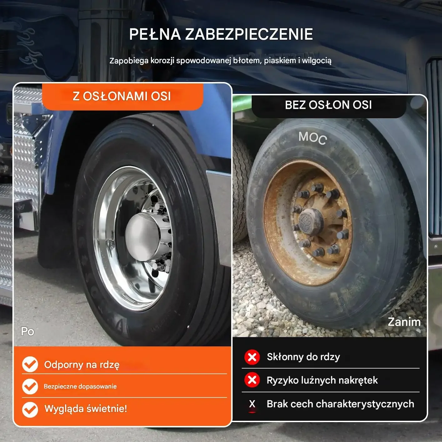 • Pełna ochrona: osłona chroni nakrętki kół i oś przed kurzem, wilgocią i solą
