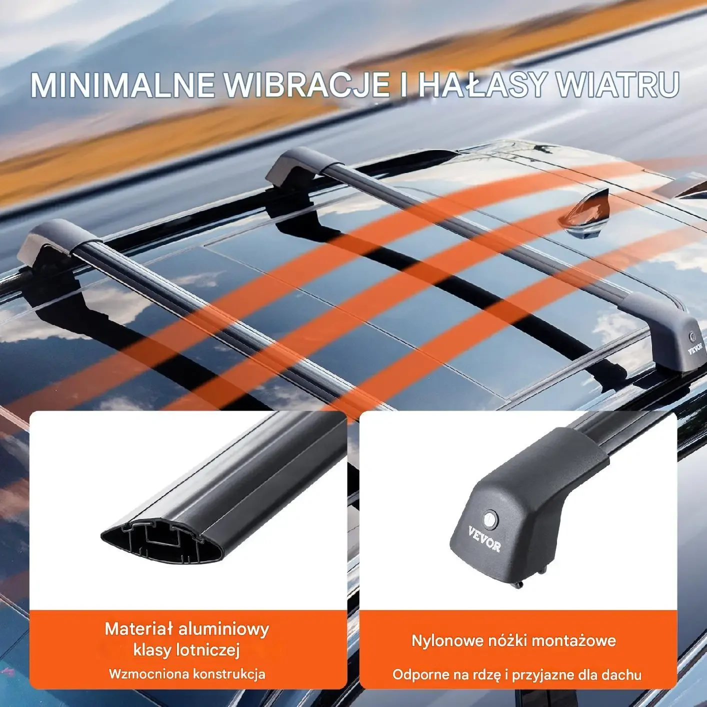 Minimalne wibracje i hałasy wiatru dzięki aluminiowej konstrukcji klasy lotniczej oraz wzmocnionej konstrukcji. Nylonowe nóżki montażowe są odporne na rdzę i delikatne dla dachu, zapewniając trwałość i ochronę lakieru pojazdu.