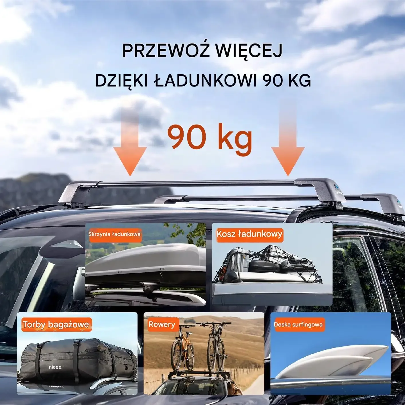 - ✅ Waga netto 4,54 kg: Lekkie, ale wytrzymałe, nie obciążają nadmiernie dachu pojazdu.