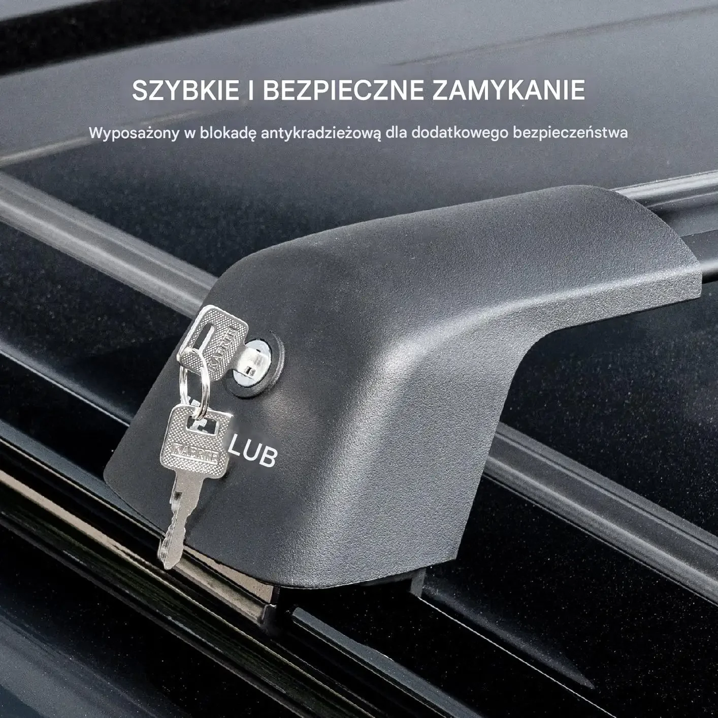 Produkt wyposażono w zestaw kluczy i zestaw imbusowy (m5 x 1) do szybkiego montażu i zabezpieczenia. Do zestawu dołączone są wszystkie niezbędne elementy montażowe, w tym klucze do zabezpieczenia i blokady, co ułatwia instalację i zapewnia stabilność całego systemu na dachu pojazdu.