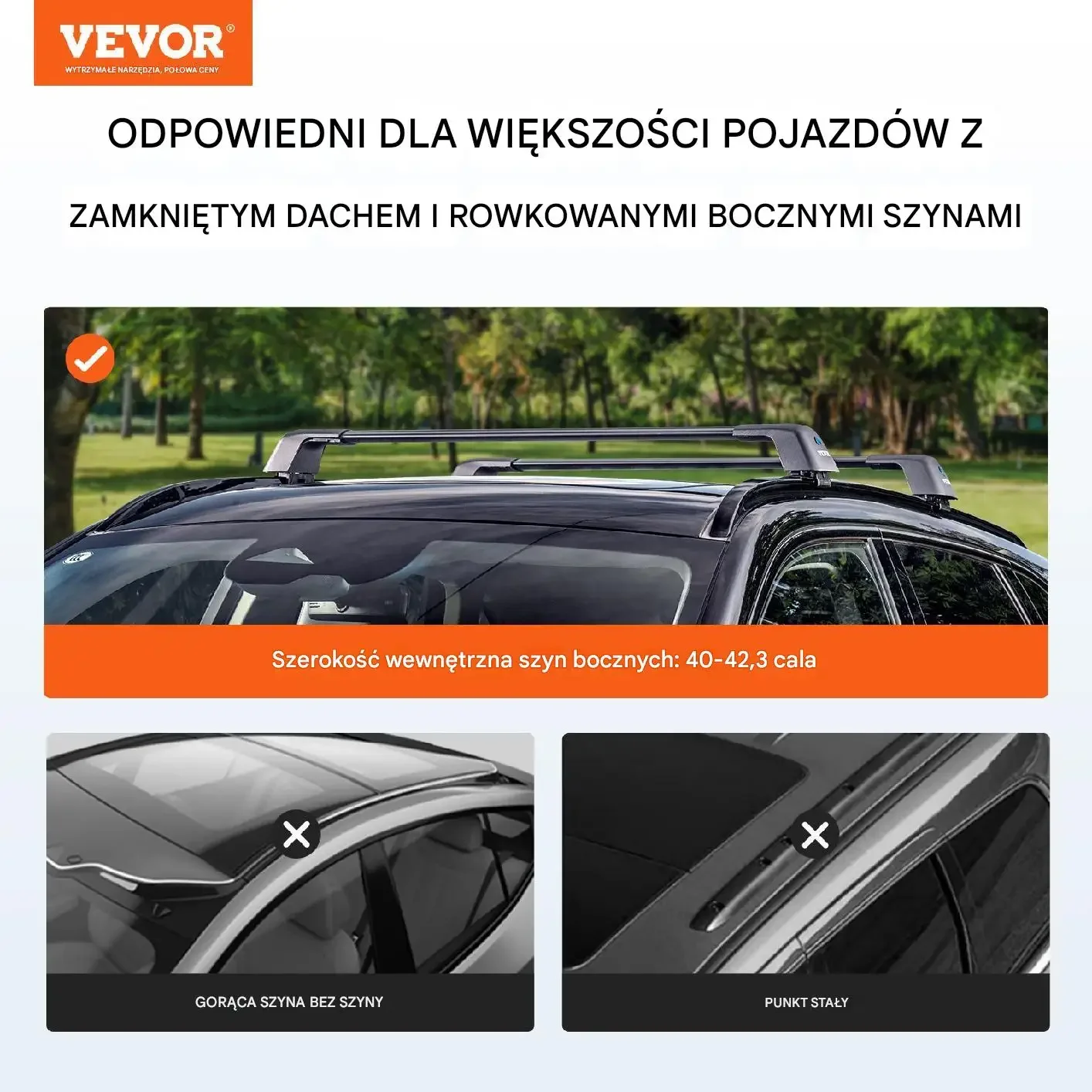 Rozmiar produktu obejmuje szerokość i dopasowanie do belki dachowej o zakresie 40–42,3 cala (około 101,6–107,3 cm), umożliwiając bezproblemowy montaż na większości popularnych modeli samochodów z relingami dachowymi.