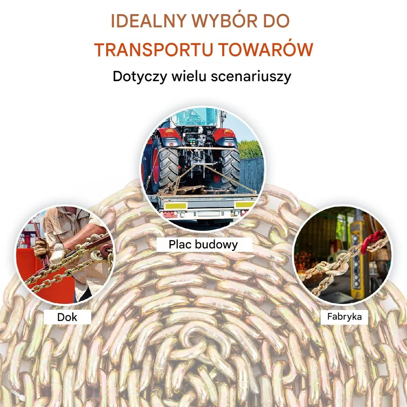 Łańcuch transportowy klasy 80 wykonany ze stali manganowej o średnicy 9,5 mm i długości 6,1 m, zaprojektowany do bezpiecznego transportu i holowania ciężkich ładunków. Charakteryzuje się wyjątkową wytrzymałością na rozciąganie oraz spełnia wysokie standardy bezpieczeństwa dzięki współczynnikowi bezpieczeństwa 4:1.