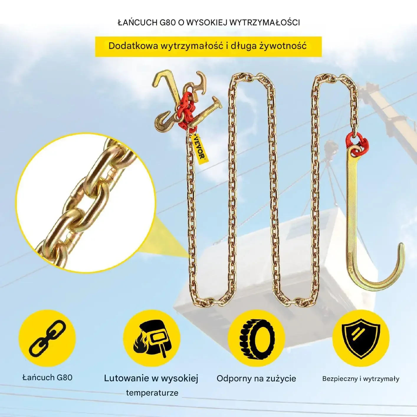 Zawiesia łańcuchowe klasy G80 wykonane ze stali manganowej, o nominalnym udźwigu 4200 kg, zapewniające bezpieczne i efektywne podnoszenie oraz transport ciężkich ładunków. Każde ramię wyposażone jest w 118 ogniw łańcucha o średnicy 7,6 mm z powłoką cynkowaną dla odporności na korozję oraz solidny hak J o długości 38 cm.