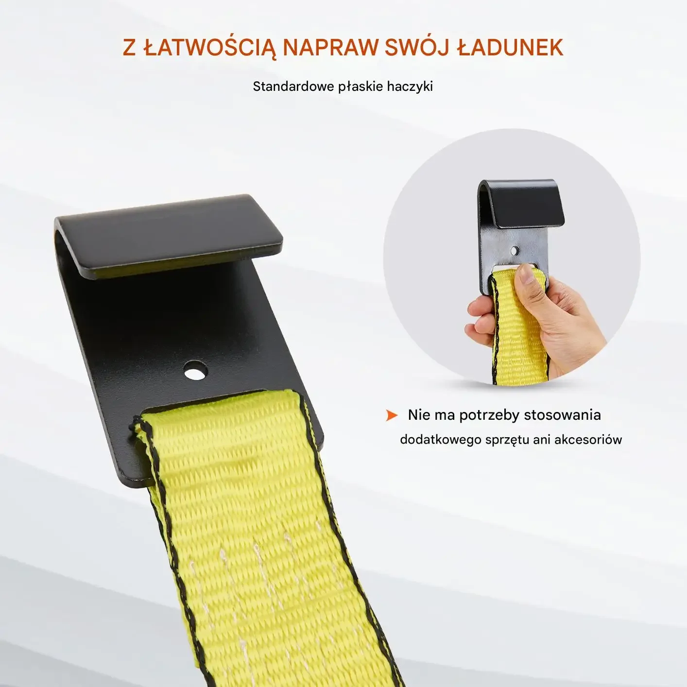 Solidne, płaskie haczyki i solidny mechanizm zapadkowy zapewniają bezpieczne mocowanie ładunku, nawet przy wymagających scenariuszach transportowych. Dzięki prostemu projektowi, naprawa i ponowne użycie są szybkie i niezawodne.