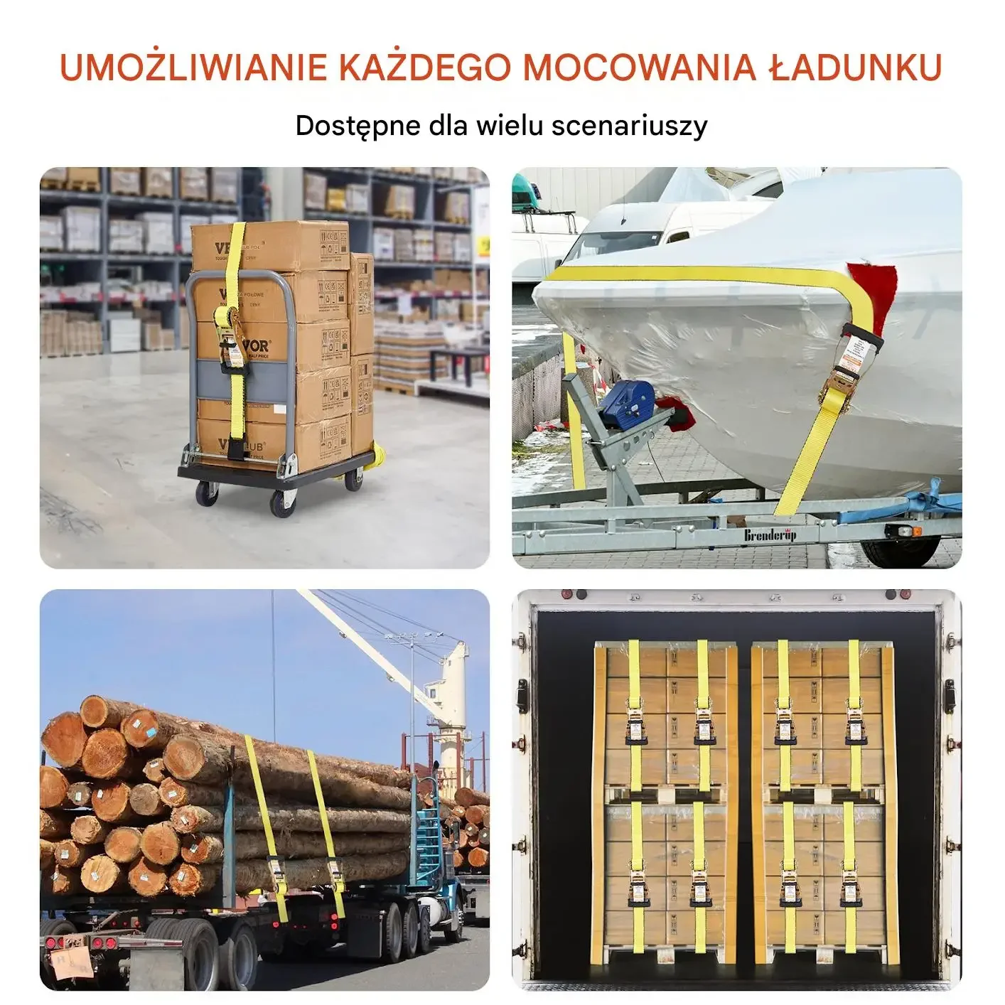 Komplet obejmuje różne scenariusze przewozu: od przenoszenia ciężkich paczek, przez zabezpieczanie kontenerów i ciężkich ładunków na niskich podwoziach, po zabezpieczenie materiałów opałowych i drewna podczas transportu. Produkt nadaje się do różnych zastosowań i jest dostępny w zestawach wielokrotnych użyć.